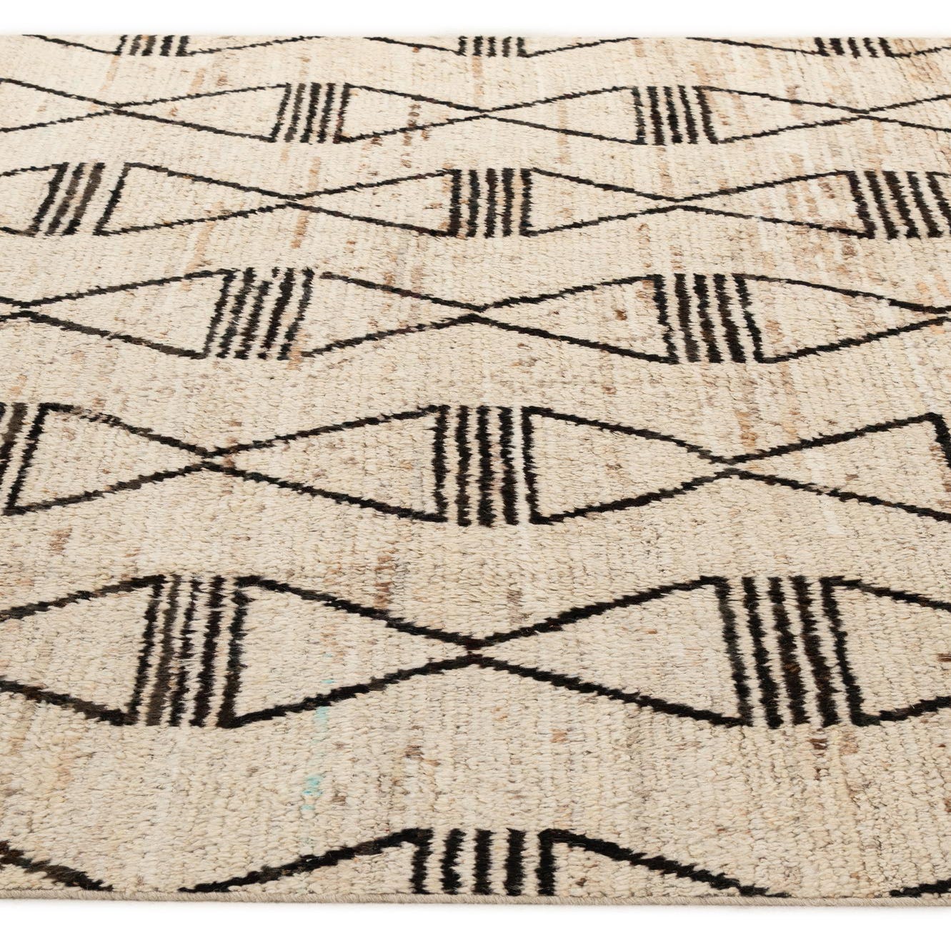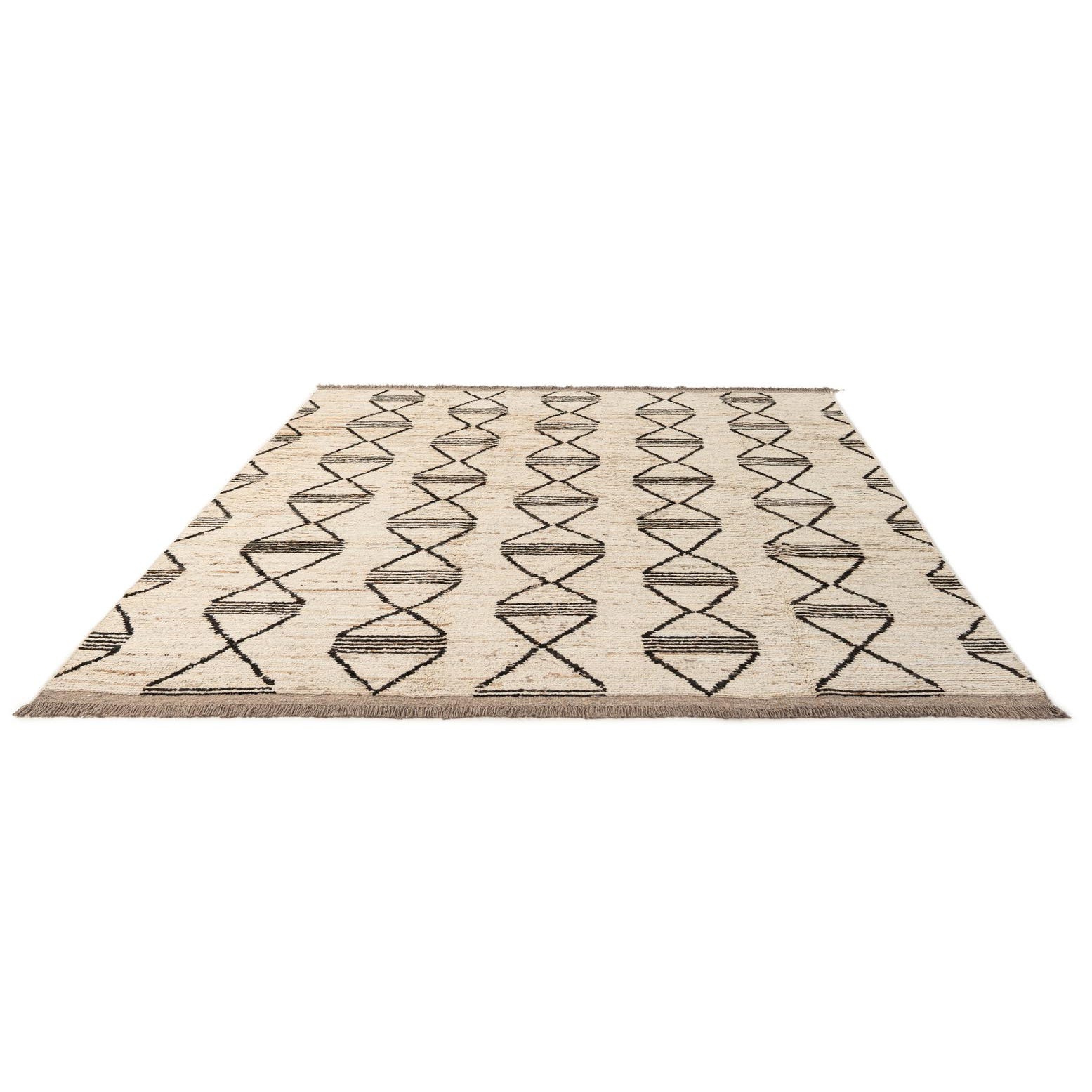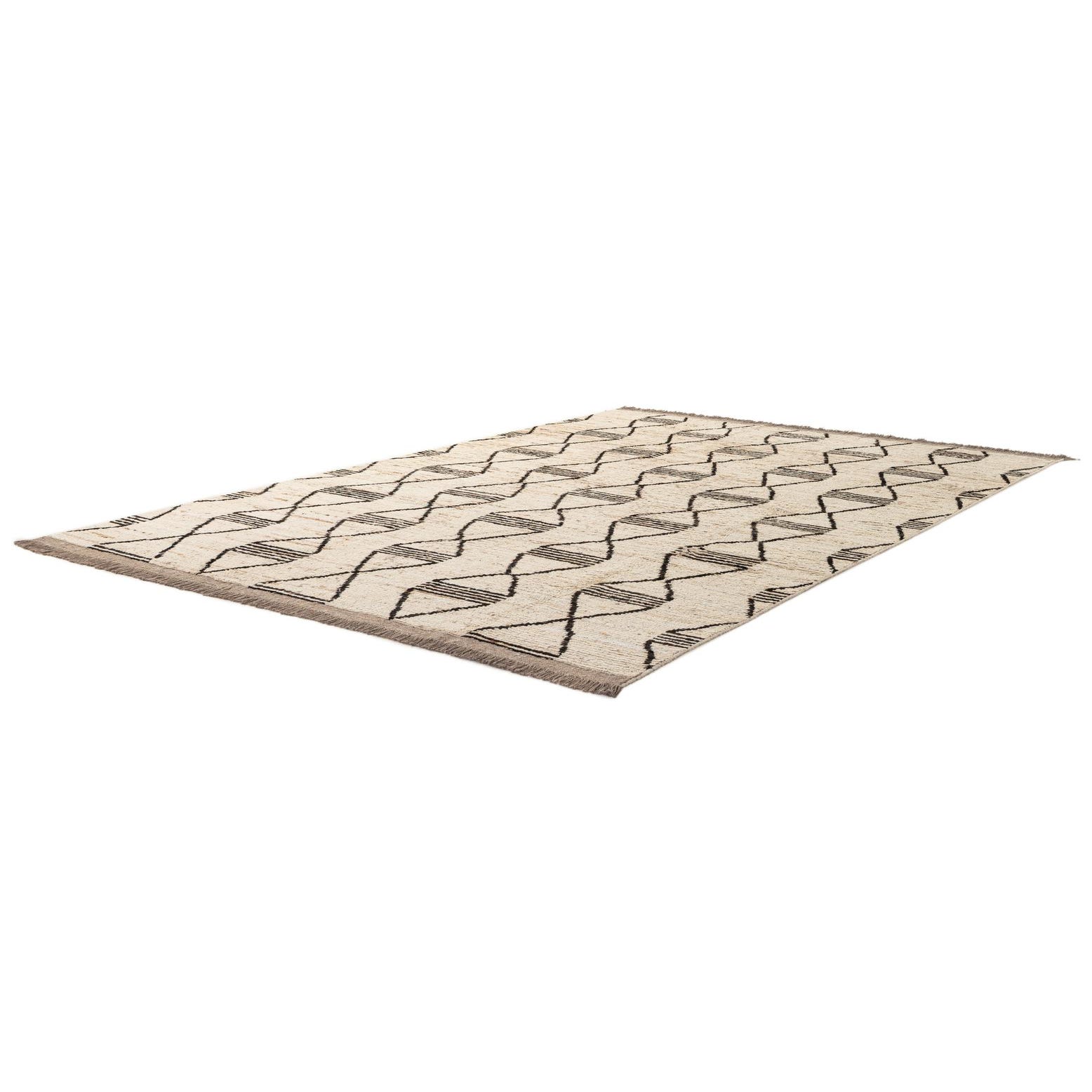 A 7x10 rectangular ivory wool rug with a black tribal geometric pattern and fringed edges.