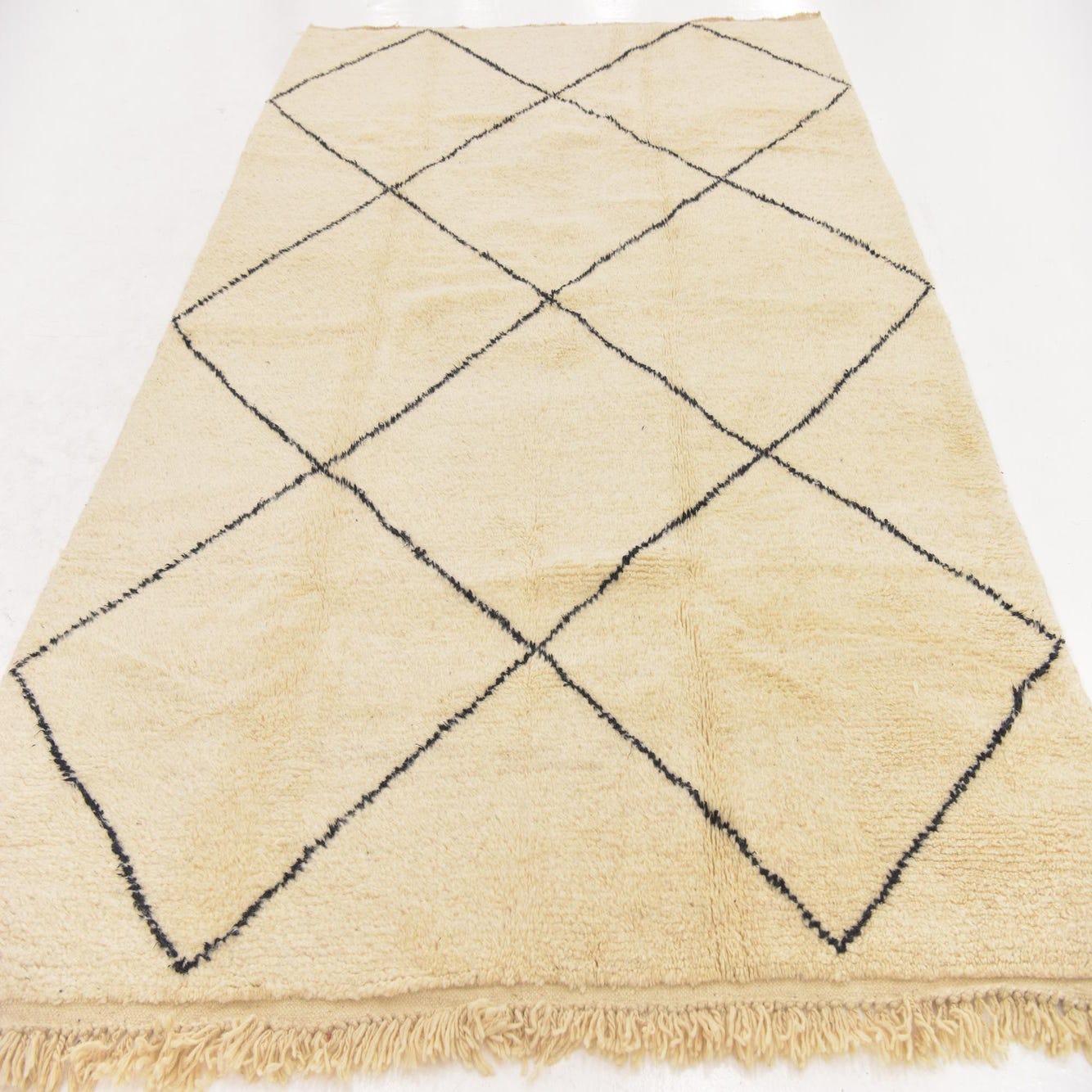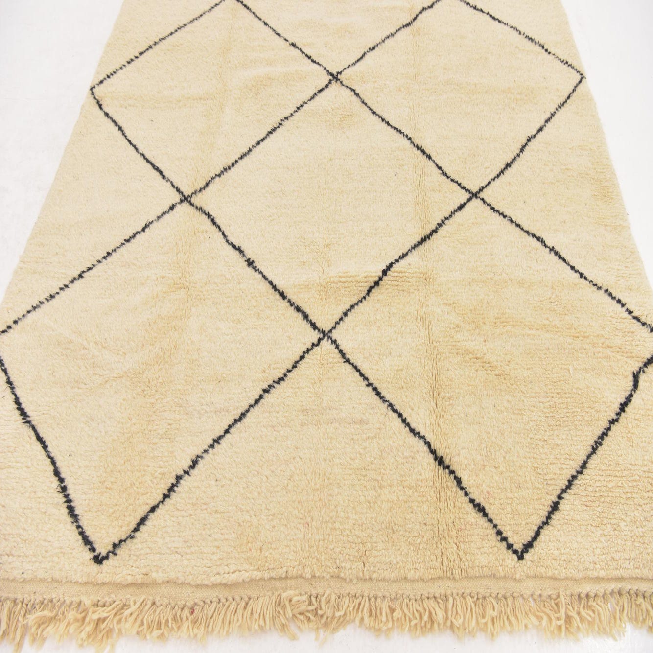 This Moroccan collection rug is a hand-knotted piece that showcases a classic geometric design in a timeless black and ivory color palette. The background color of ivory provides a neutral base, while the black angular lines create an understated yet impactful diamond pattern across the rug's surface. Measuring 7 feet by 10 feet, this rug's semi-antique status, dated approximately 40-60 years old, brings with it a sense of history and character.