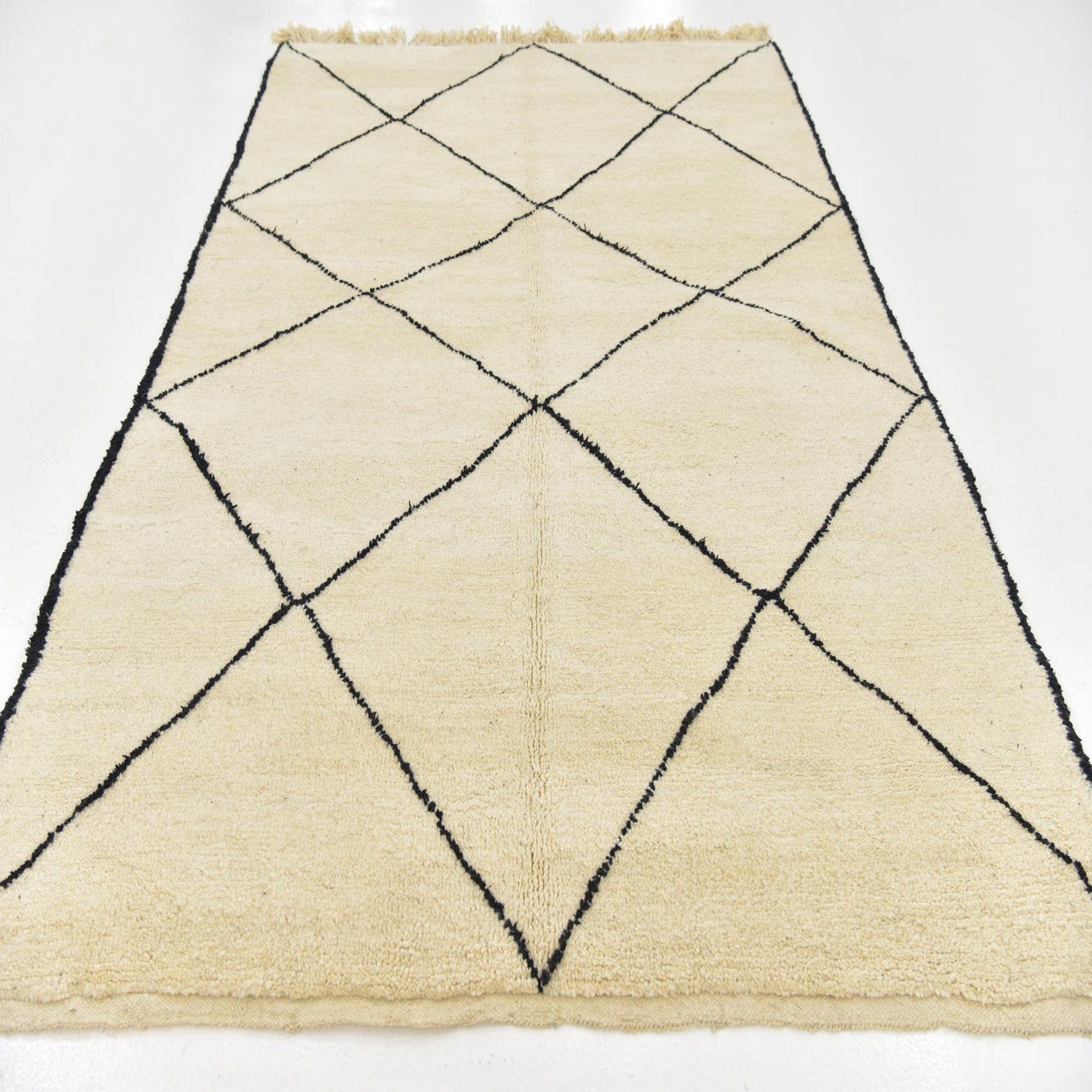This Moroccan collection rug is a hand-knotted piece crafted with 100% wool, offering a plush texture and durability. Measuring 7x10, the rug features a timeless ivory background contrasted with a black geometric pattern that imbues it with a bold and dynamic character. The design showcases a series of diamond shapes that intersect and link together, creating a tessellated and eye-catching effect. The presence of fringe on either end adds an additional layer of traditional craftsmanship. The semi-antique status of the rug, aged between 40-60 years, lends it a storied and authentic feel that can elevate the aesthetic of any room.