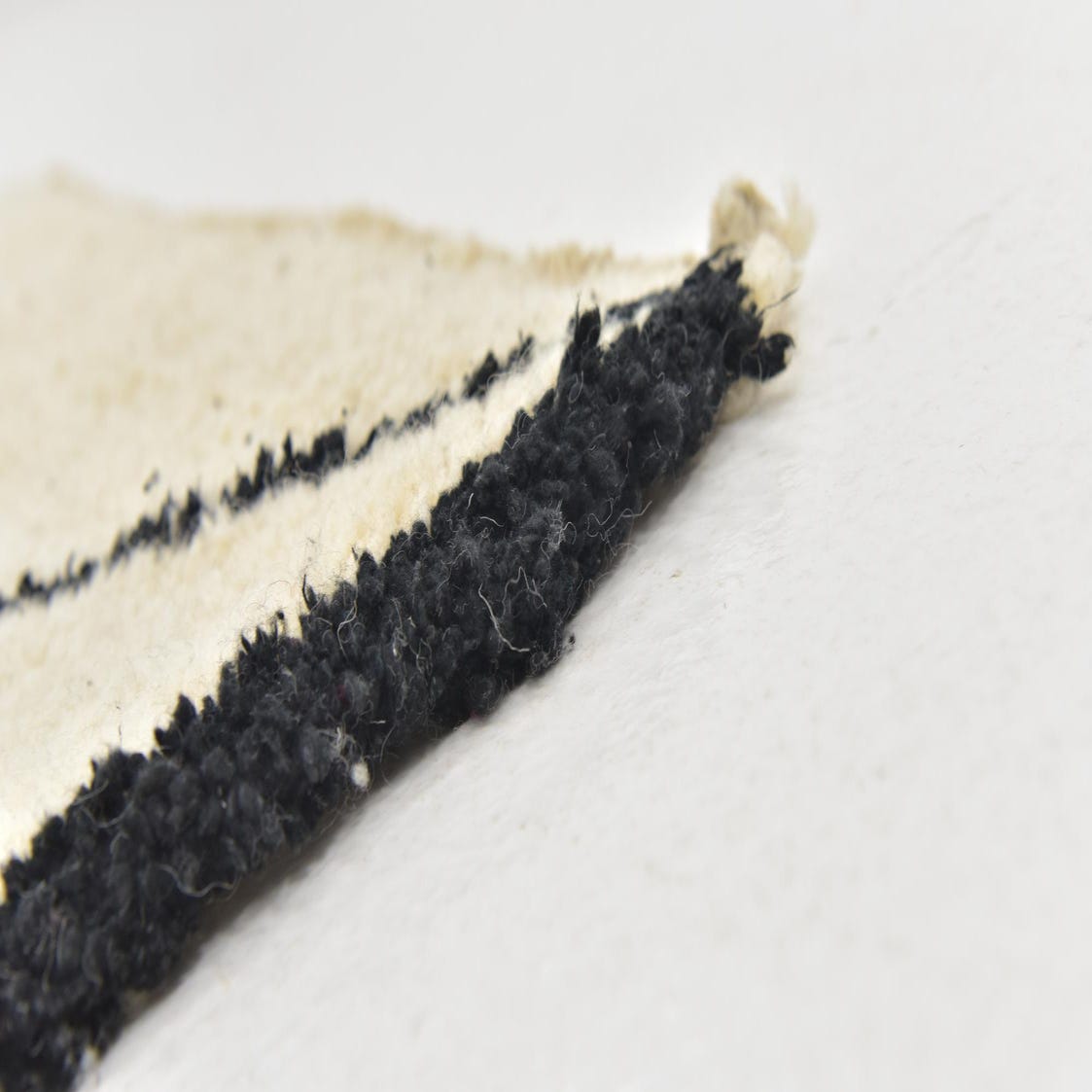 The ivory and black color palette ensures versatility, allowing for seamless integration into various interior design themes, from minimalist and modern to more eclectic and bohemian spaces. This rug could serve as a statement piece in a clean, contemporary setting or complement the rich textures and colors of a more globally-inspired decor. Given its hand-knotted wool construction, it could also provide warmth and grounding in a living room, bedroom, or dining area where comfort is a priority.