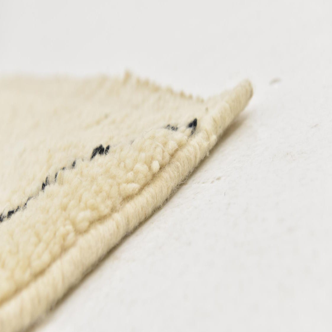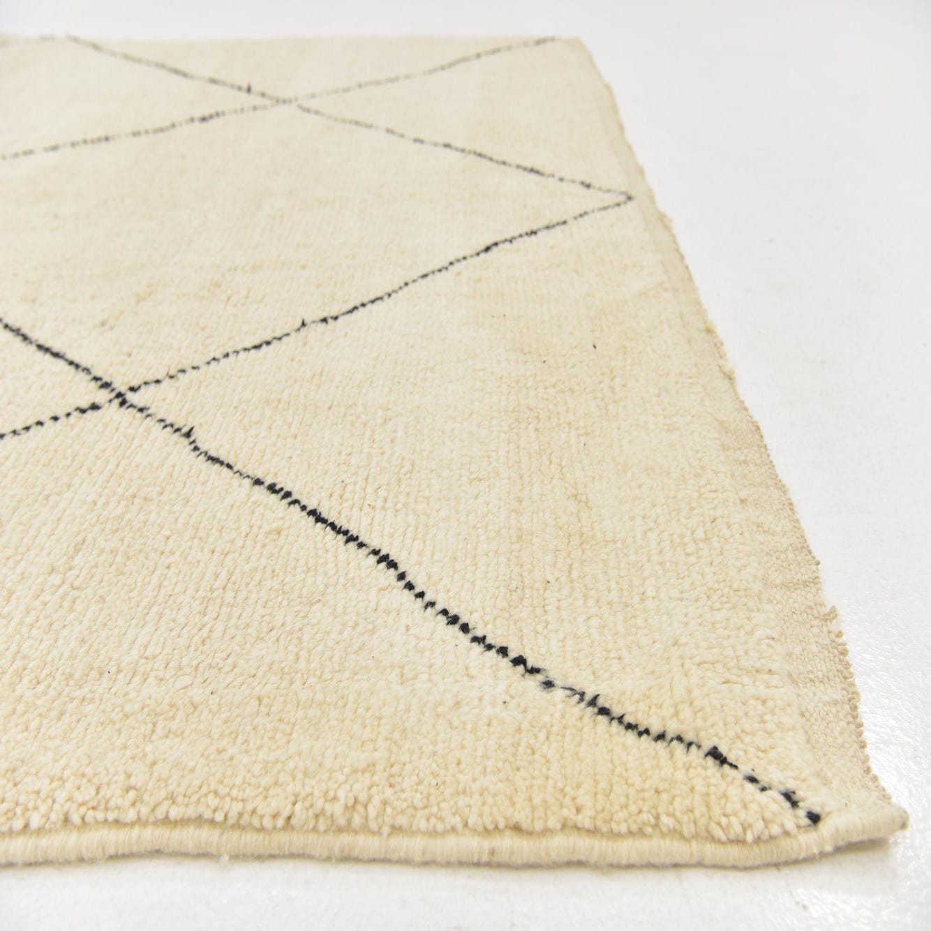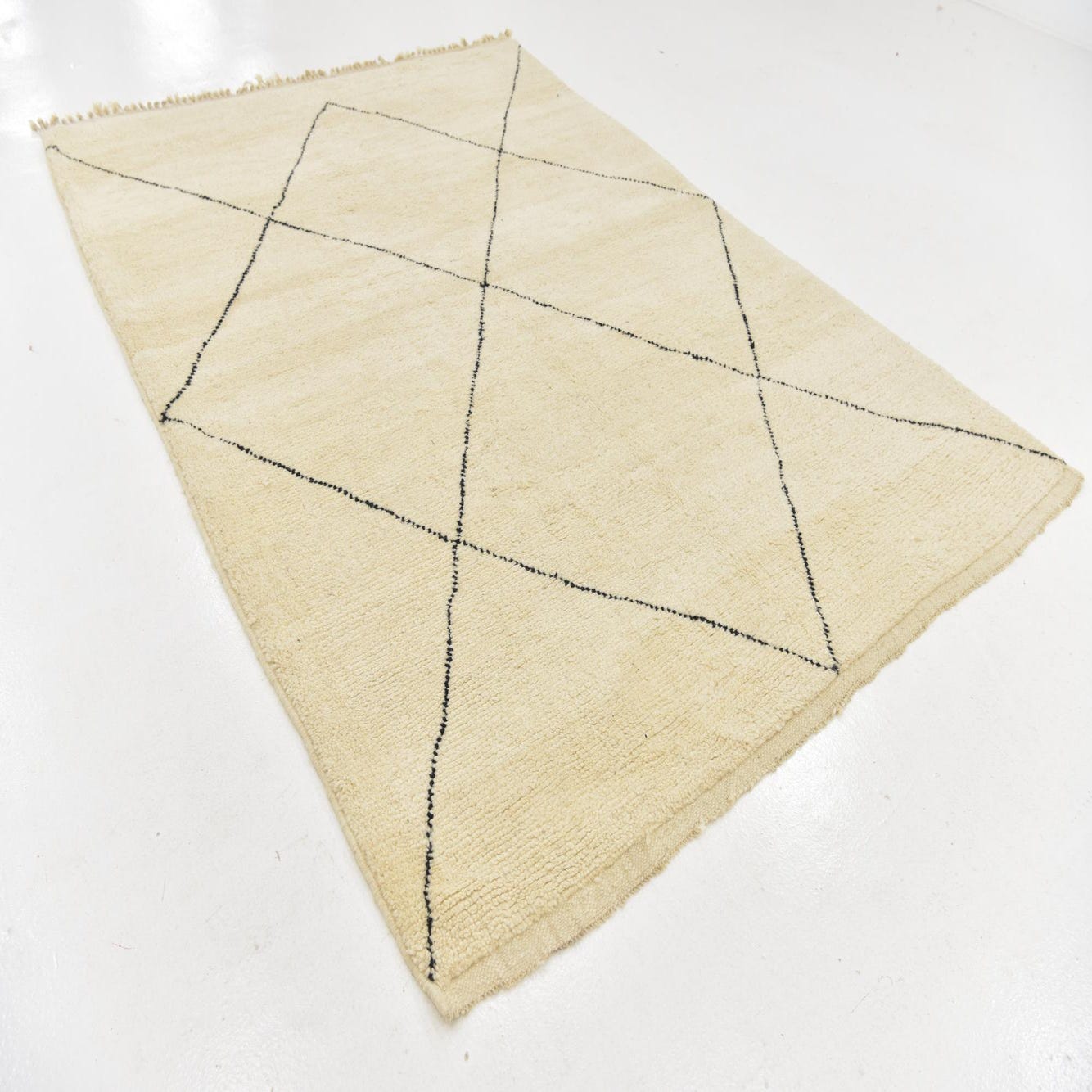 This rug could be seamlessly integrated into a variety of decor settings. In a minimalist or Scandinavian-inspired space, the contrast of the black and ivory would provide a striking visual anchor without overwhelming the room's clean lines and neutral tones. In a bohemian-styled area, the Moroccan influence and distinctive pattern could mix eclectically with textured fabrics and global accents. The rug's moderate size is well-suited for living rooms, dining areas, or larger bedrooms where it would add warmth and a refined touch to the space.