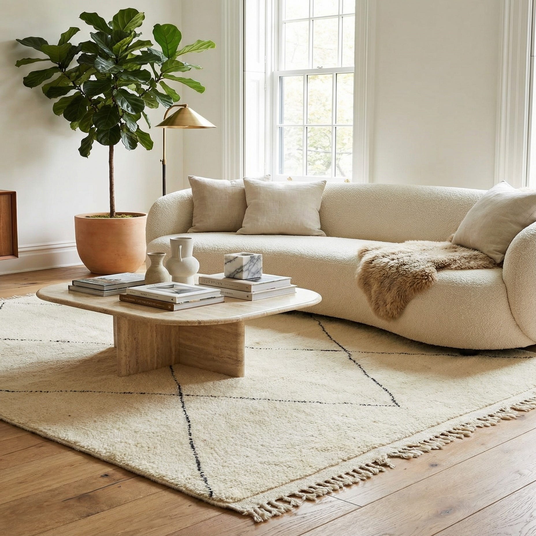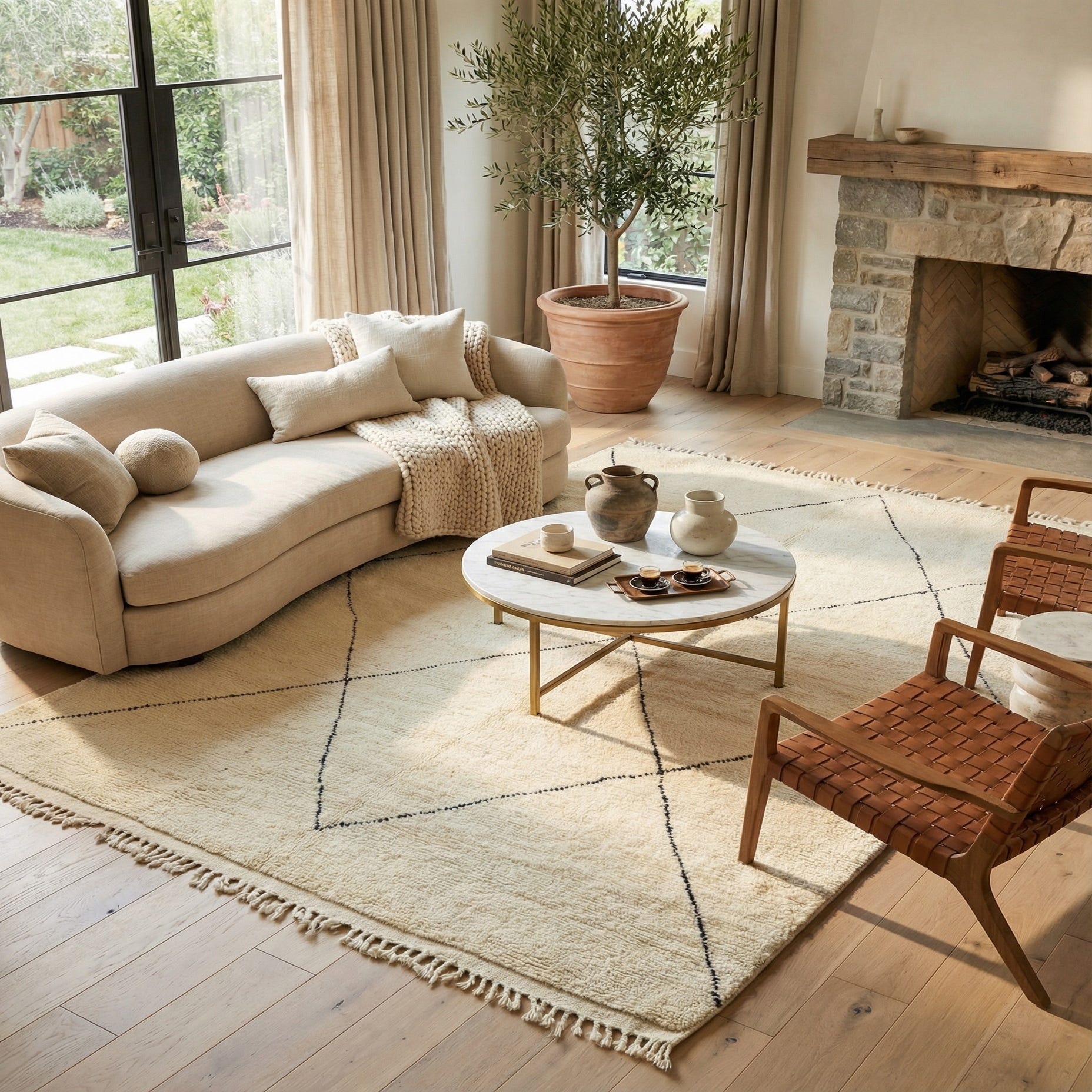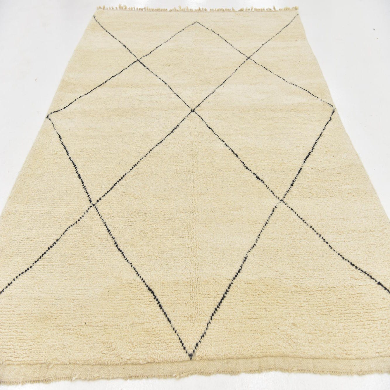 This rug could be seamlessly integrated into a variety of decor settings. In a minimalist or Scandinavian-inspired space, the contrast of the black and ivory would provide a striking visual anchor without overwhelming the room's clean lines and neutral tones. In a bohemian-styled area, the Moroccan influence and distinctive pattern could mix eclectically with textured fabrics and global accents. The rug's moderate size is well-suited for living rooms, dining areas, or larger bedrooms where it would add warmth and a refined touch to the space.