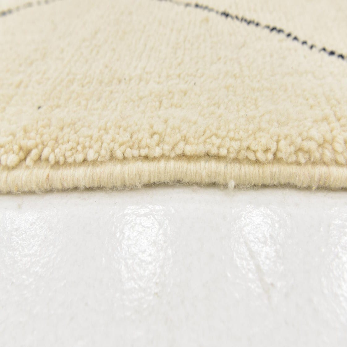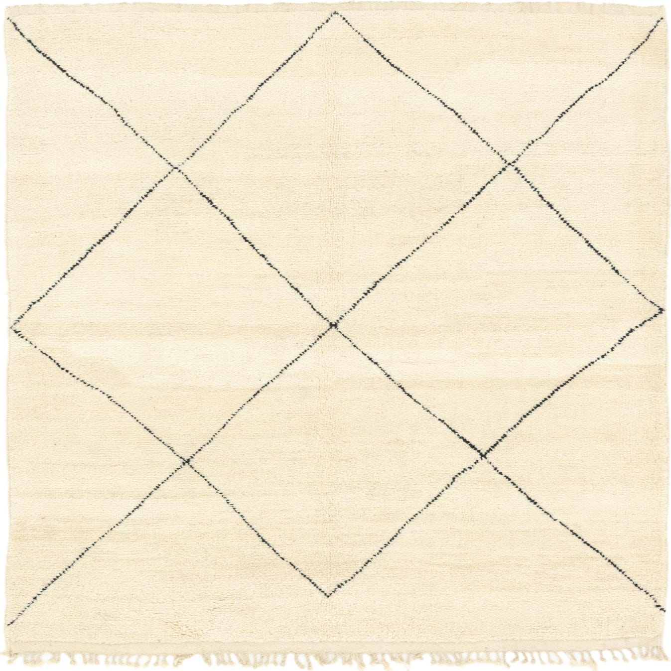 This Moroccan collection rug, measuring 7x10 feet, is a hand-knotted piece crafted from 100% wool, known for its durability and plush texture. The rug showcases a minimalist pattern characterized by a dynamic array of black diamond motifs against an inviting ivory background, which lends a contemporary yet timeless appeal to the design. The woven quality of the rug is visible in its texture, adding depth and tactile interest to the floor covering.