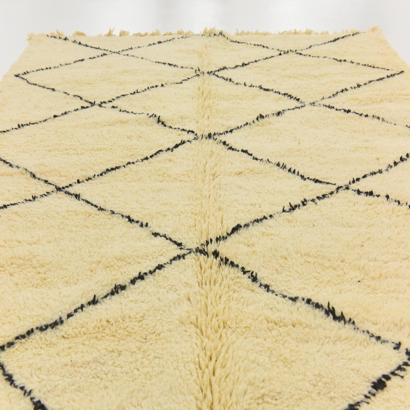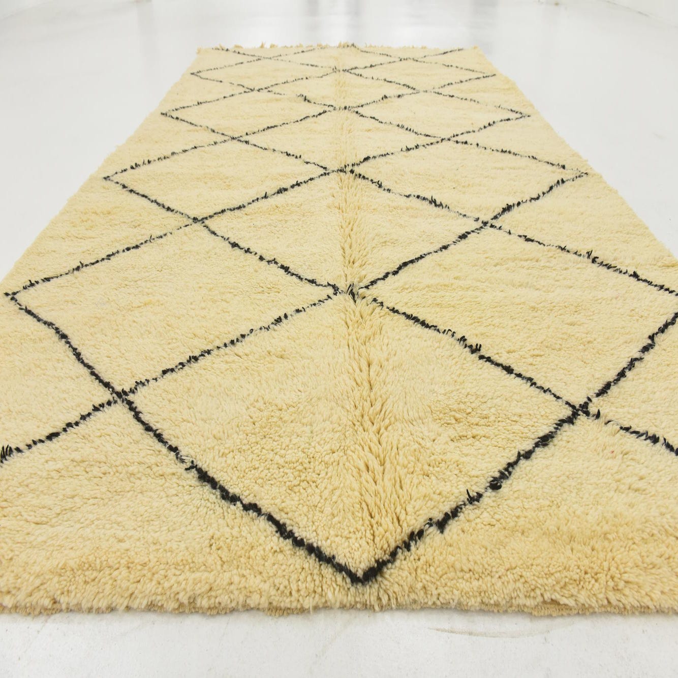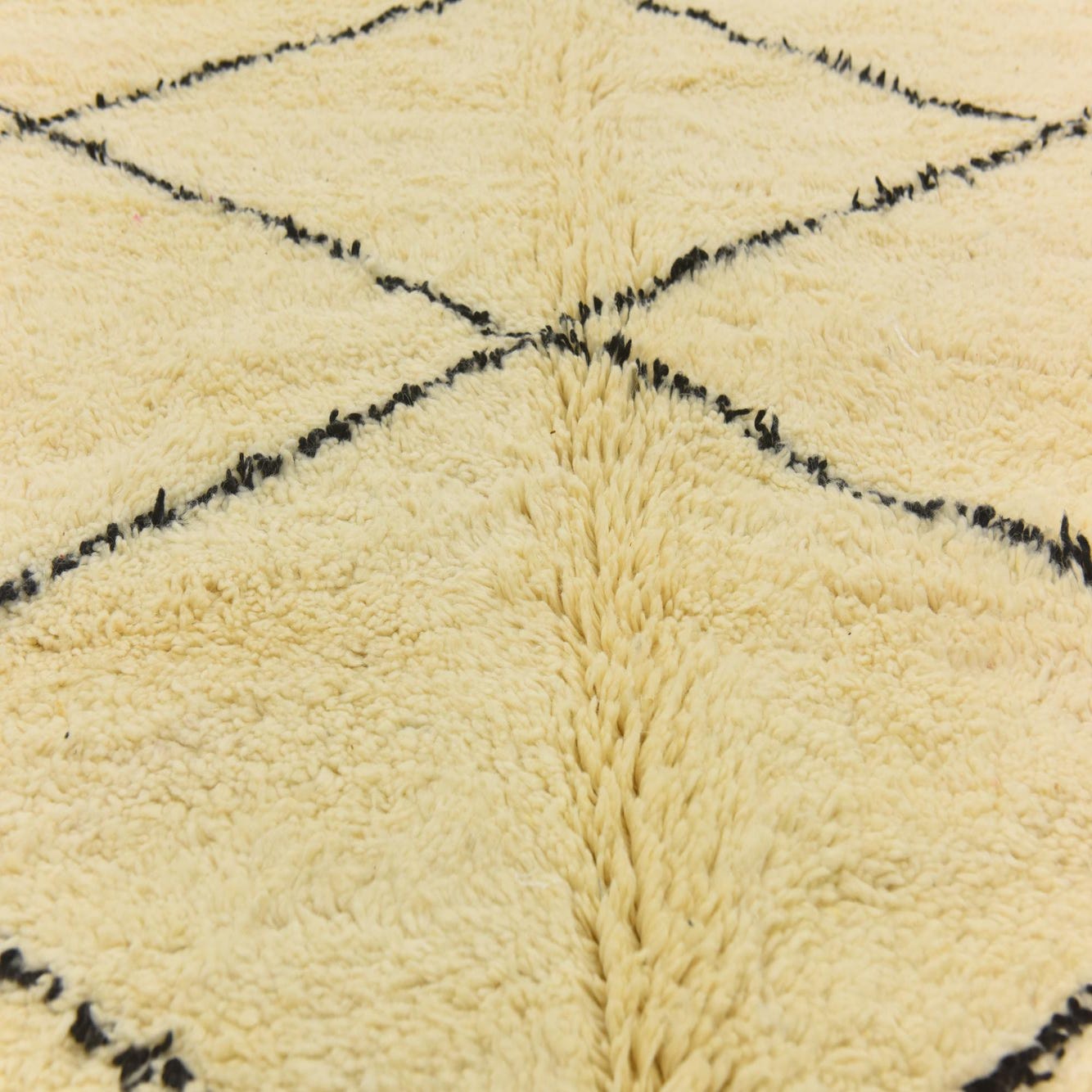 This Moroccan collection rug showcases a striking geometric pattern, articulated with clean lines in black set against an ivory background, offering a simple yet bold aesthetic. Hand-knotted from 100% wool, the rug presents a textured surface that invites touch, while providing durability and longevity. The color palette of ivory and black ensures versatility, allowing the rug to integrate seamlessly into a variety of décor styles. At 7x10 feet, it commands a notable presence in any room.