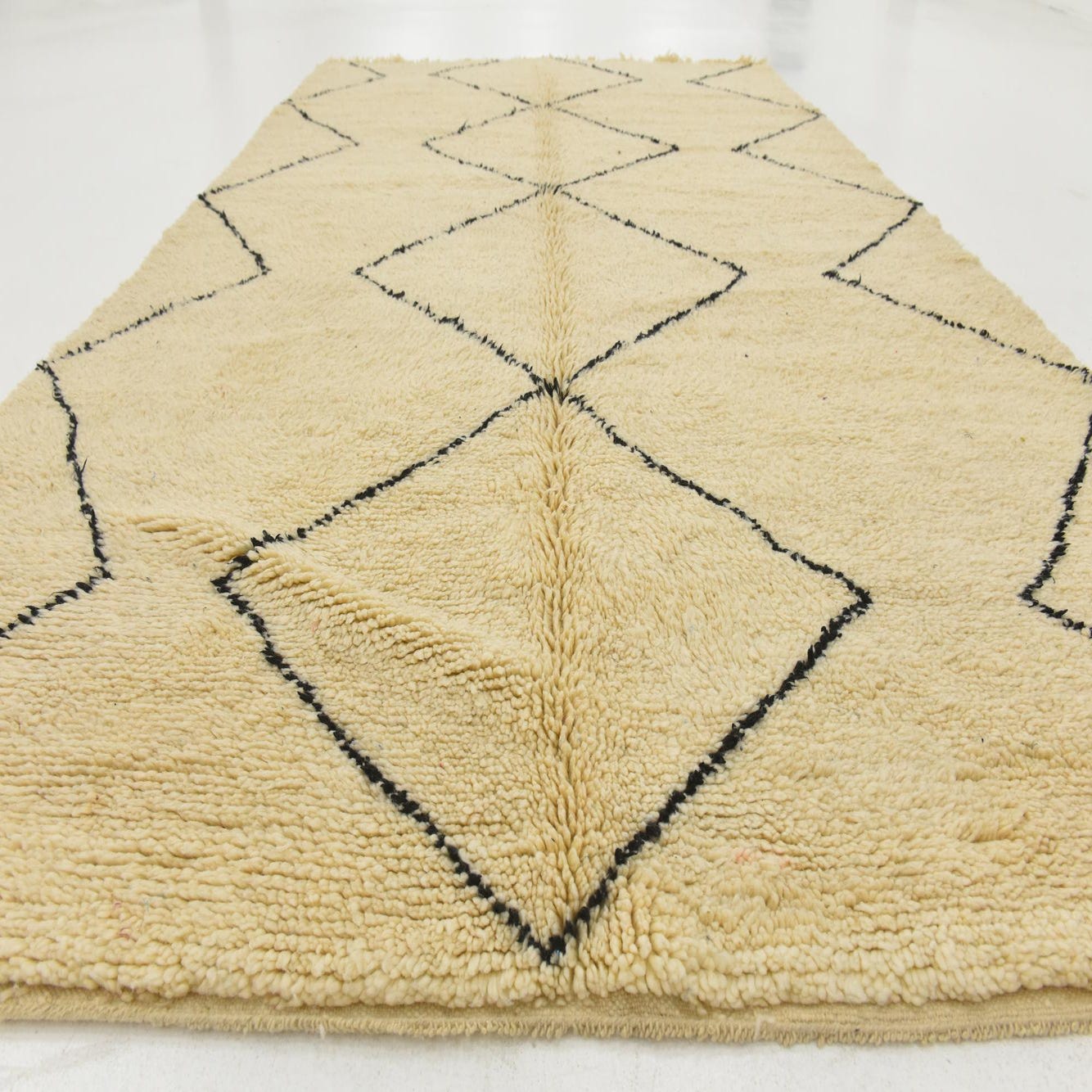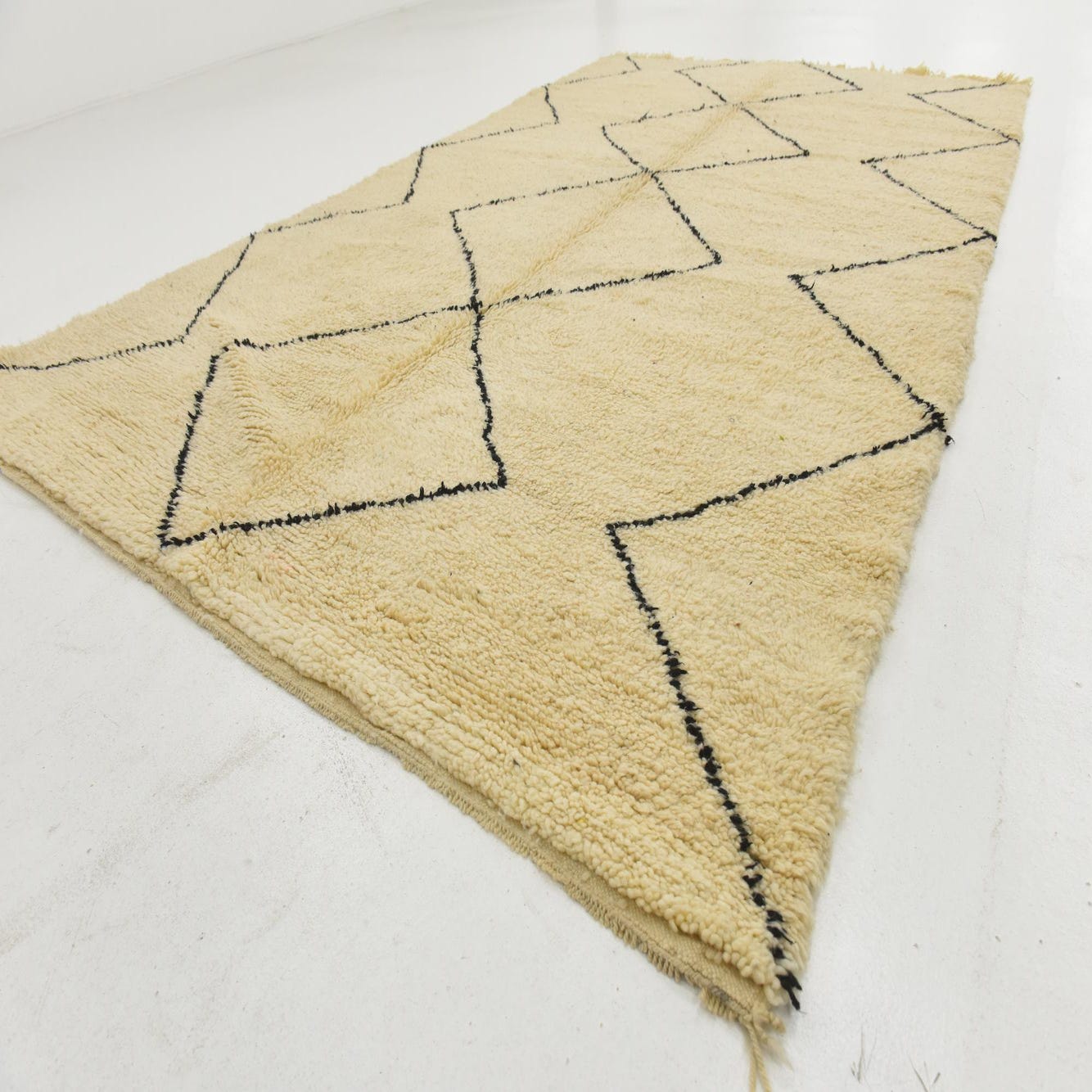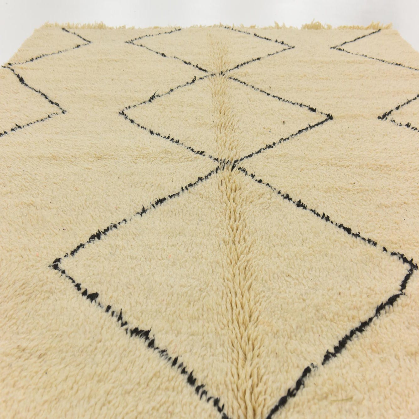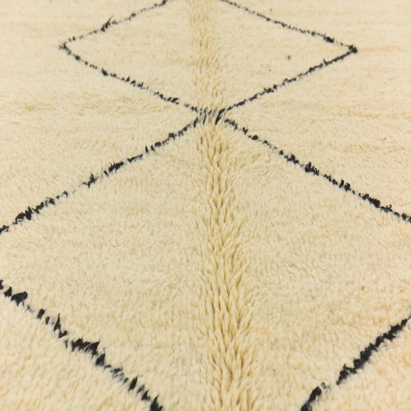 This Moroccan collection rug is hand-knotted of 100% wool, offering both durability and comfort underfoot. Spanning 7 by 10 feet, it features an inviting ivory background accented by bold, black patterns that evoke the traditional Berber tribal designs. The geometric motifs are simplified, creating a minimalist yet impactful visual allure, suitable for a variety of interior spaces.