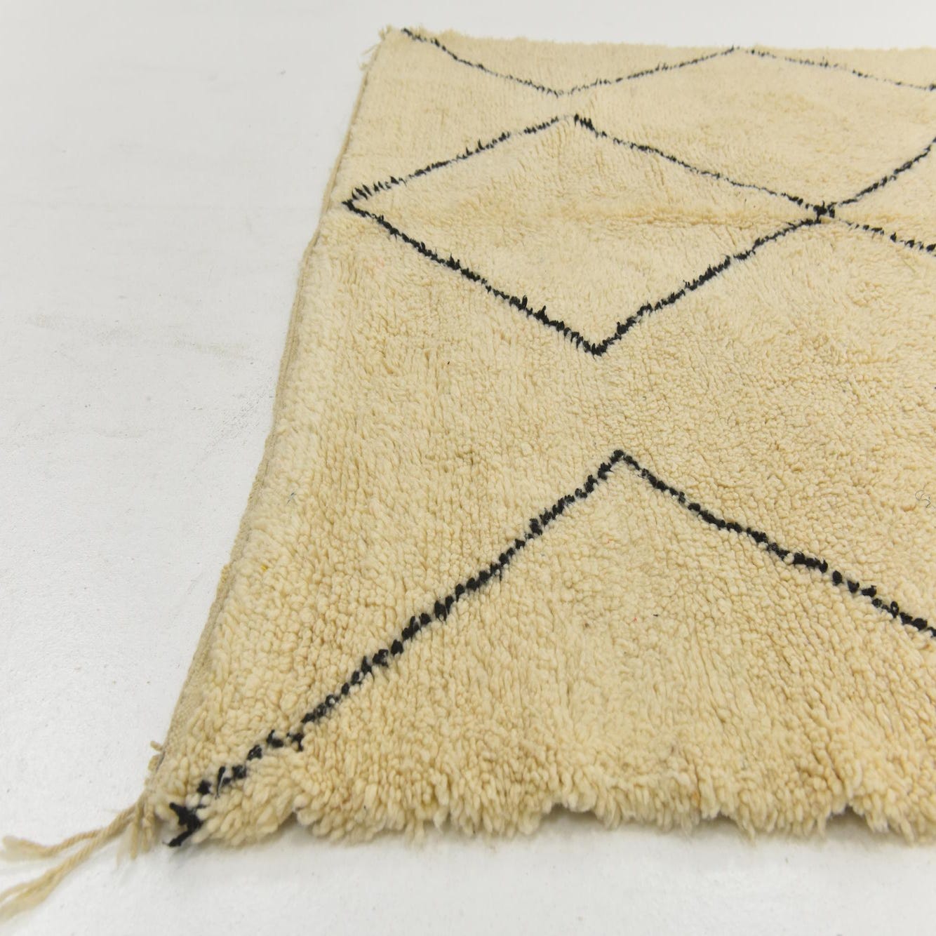 The texture of the rug is plush and indicative of high-quality wool, providing an element of tactile luxury. A distinctive characteristic of this piece is the fringe detailing, adding authenticity and a subtle decorative element to the rug's perimeter.