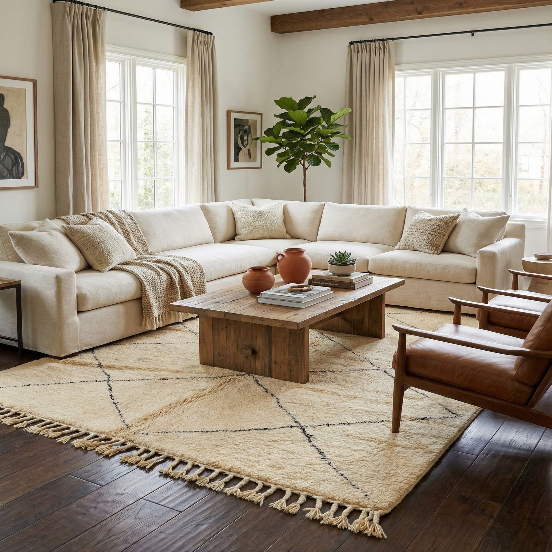 A 7x10 rectangular ivory shag rug with a black tribal diamond pattern and fringe, perfect for a living room.