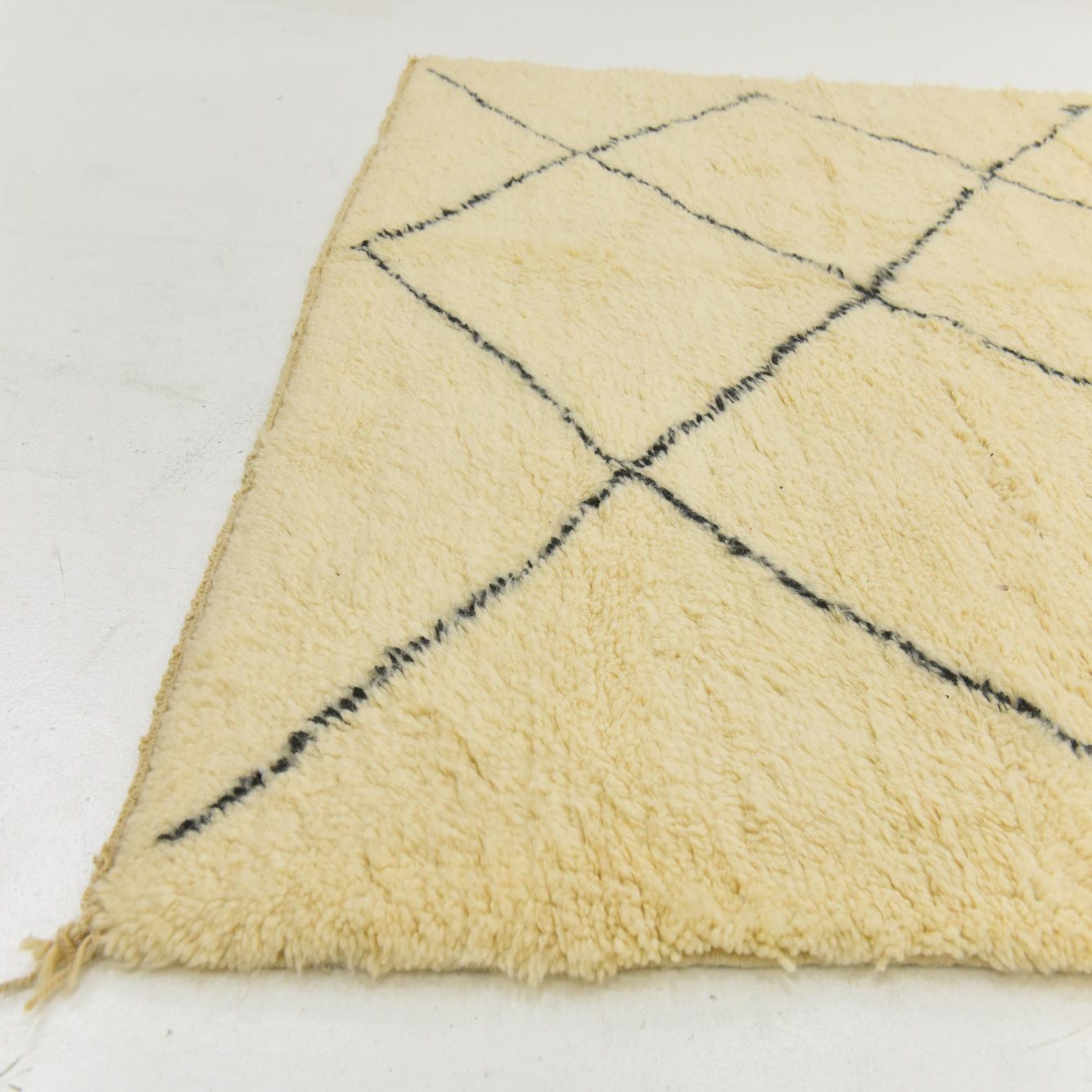 This Moroccan collection rug features a striking contrast of Ivory and Black, effectively outlining its deliberate geometric diamond pattern. Hand knotted from 100% wool, this rug offers a tactile texture that speaks to traditional craftsmanship. The piece measures 7x10 feet and boasts a semi-antique age that adds character and authenticity to the piece.