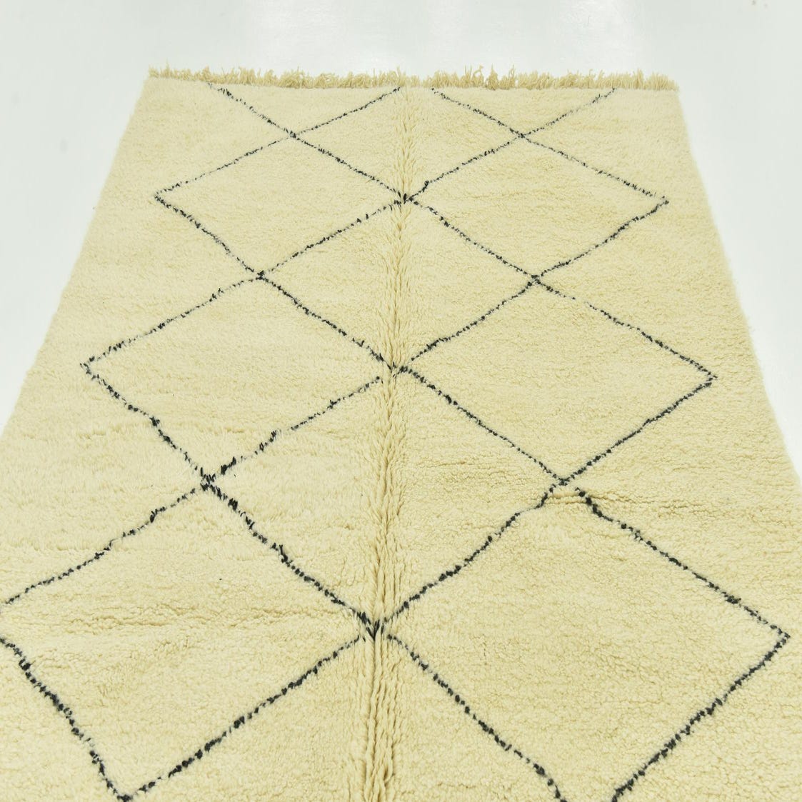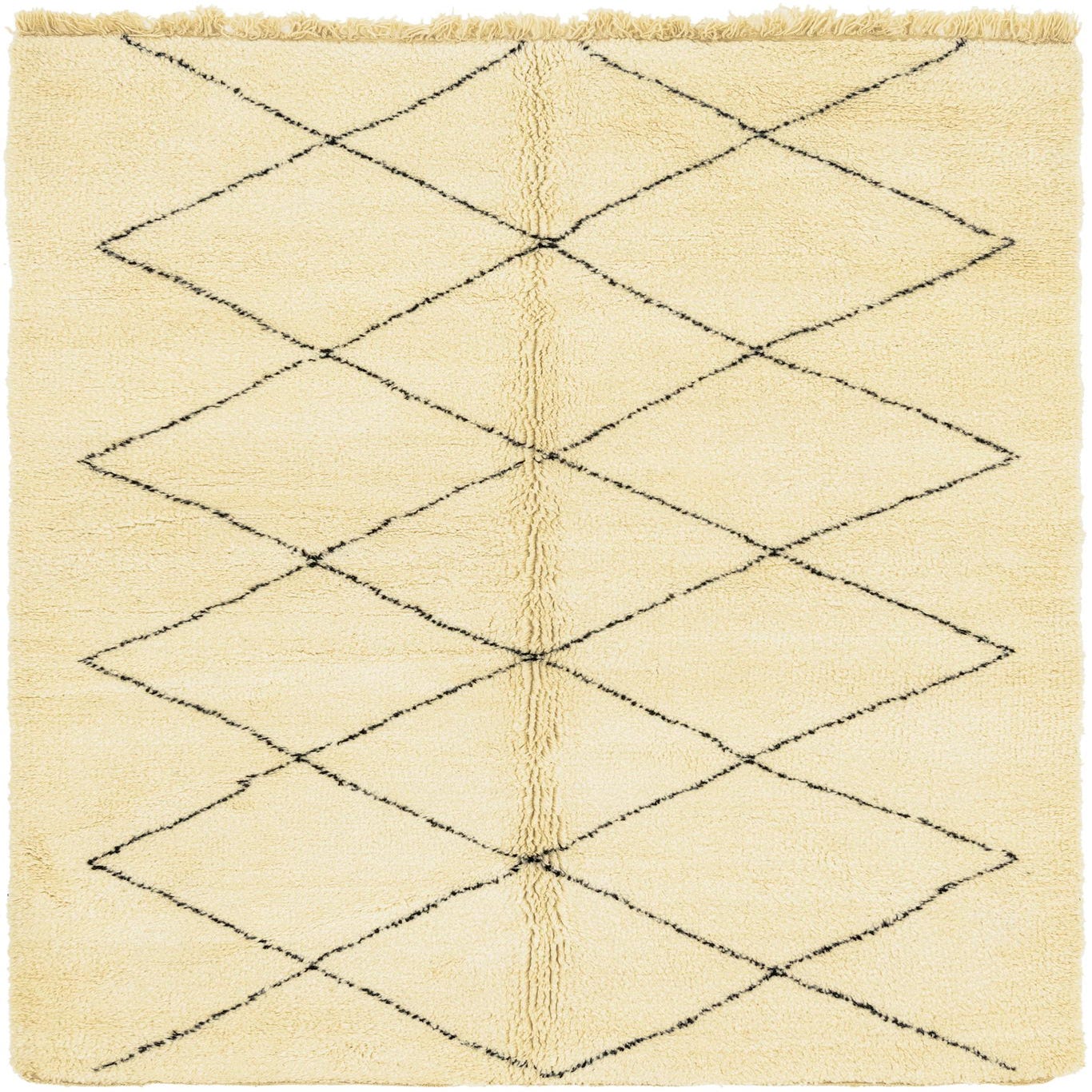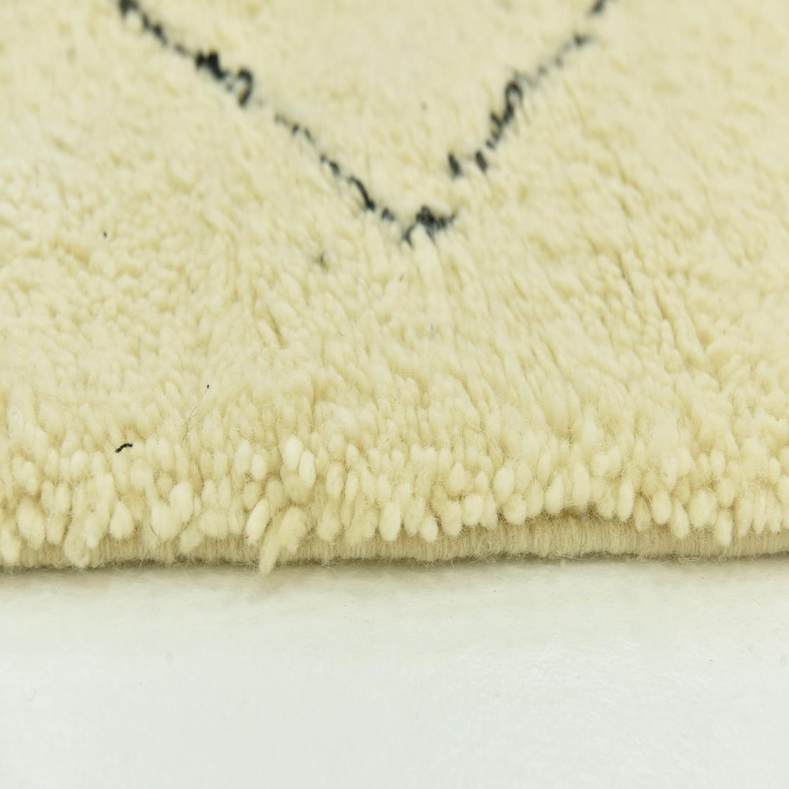 This Moroccan collection rug, measuring 7x10 feet, is a hand-knotted testament to craftsmanship and enduring style. The wool construction offers a soft, inviting texture underfoot, while the ivory background provides a neutral canvas that complements a variety of interior palettes. Adorned with a black geometric diamond pattern, this rug lends a bold, yet timeless aesthetic.