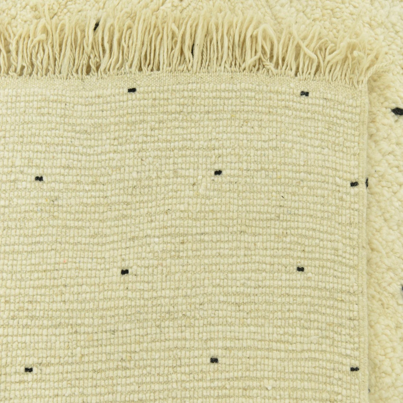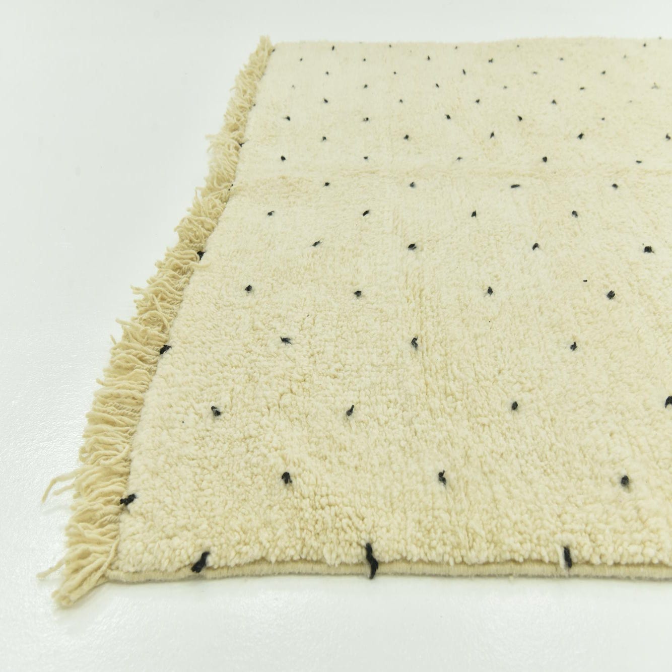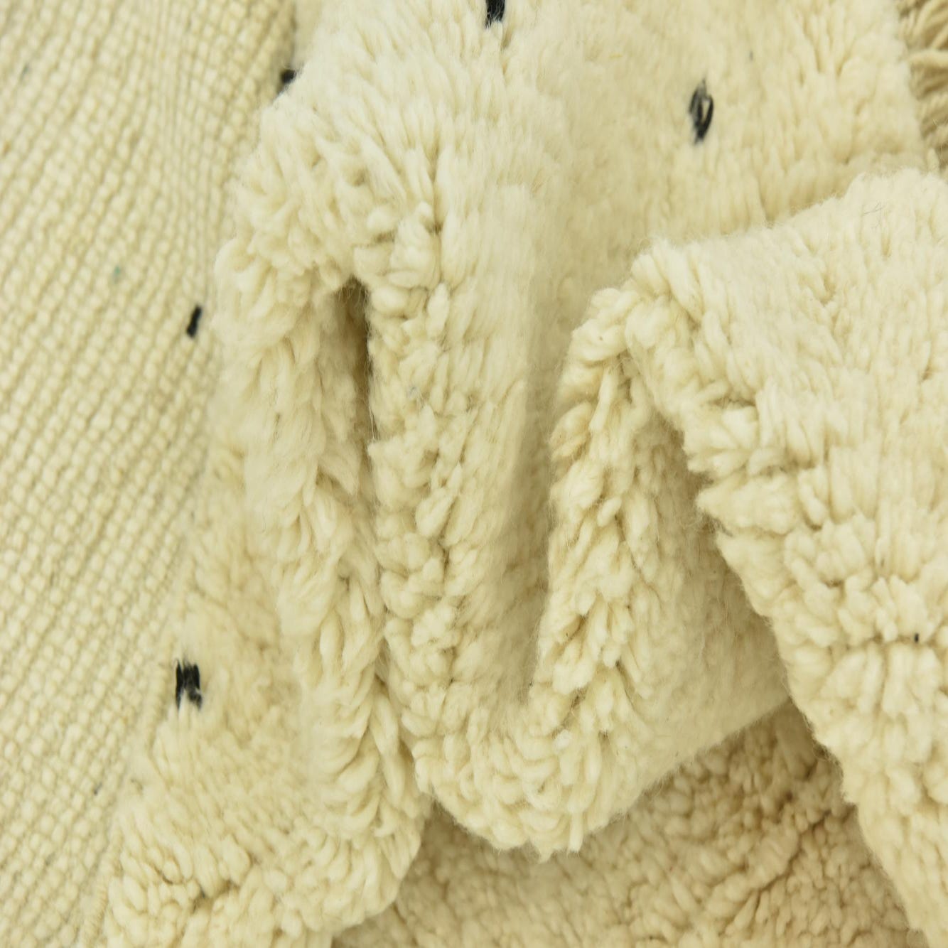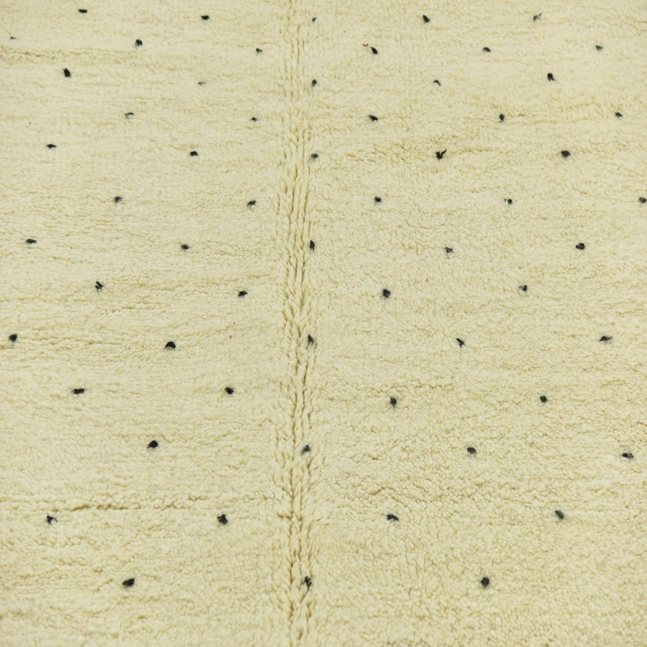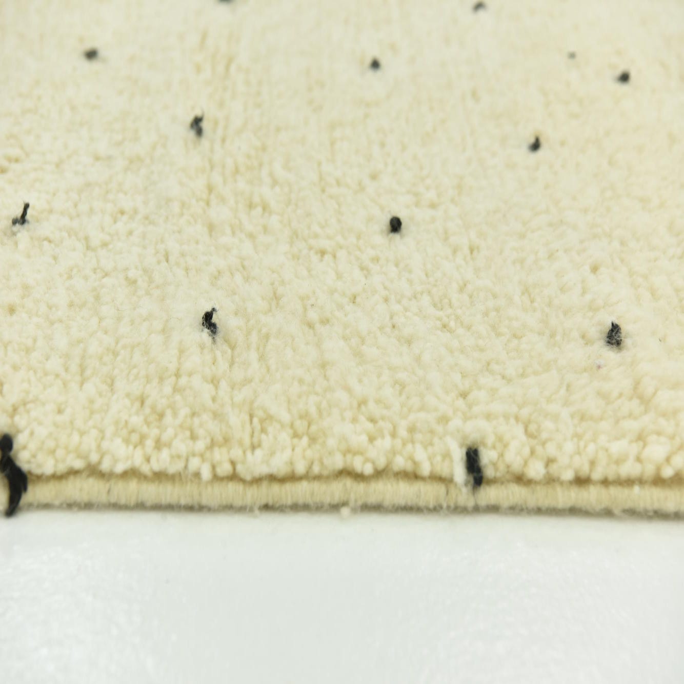 A 7x10 rectangular ivory shag rug with small, irregularly spaced black tribal dots, suitable for a living room.