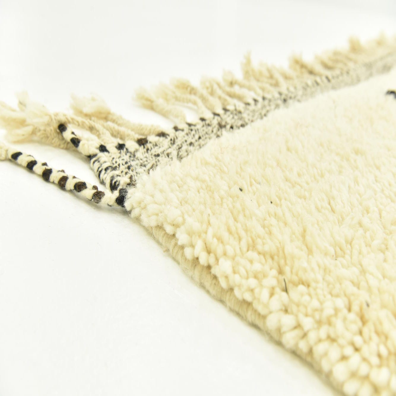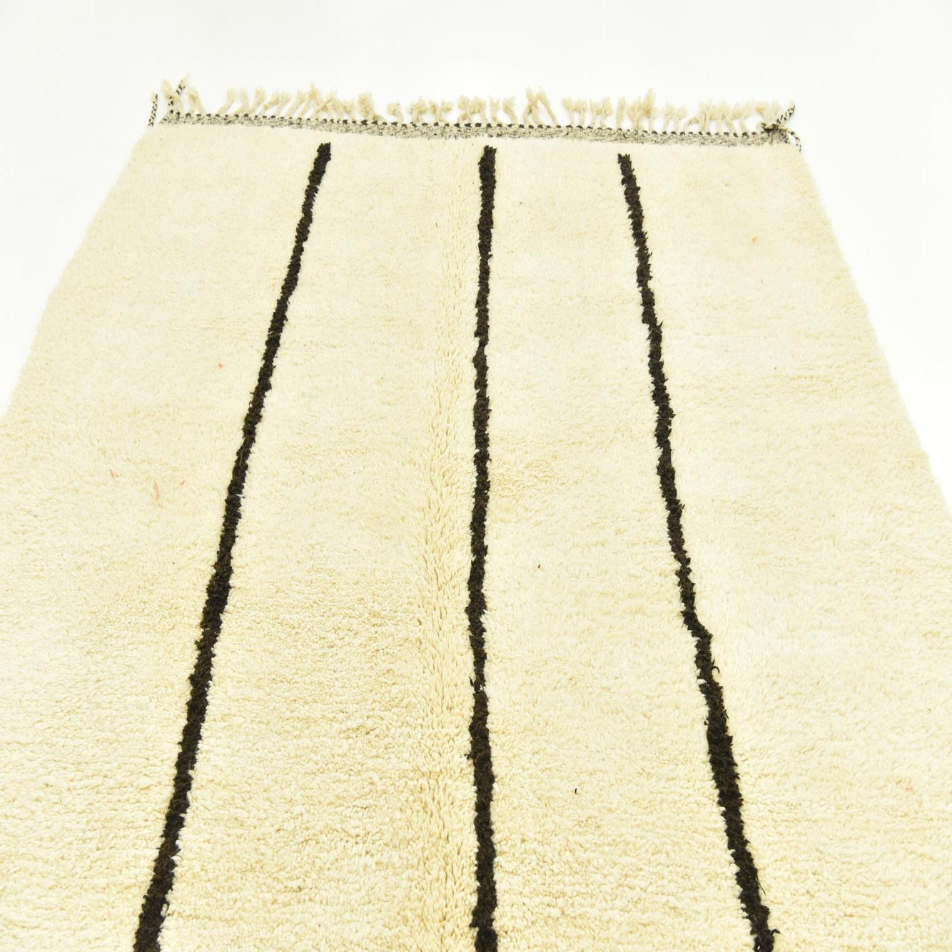 Due to its neutral palette and classic design, this rug can seamlessly integrate into various decor settings. The simplicity and timelessness of the pattern make it suitable for contemporary interiors, adding texture and interest without overwhelming the space. It could also serve as a foundation piece in a more eclectic or bohemian setting where its cultural heritage and artisanal quality can be appreciated amidst a mix of textures, colors, and patterns.