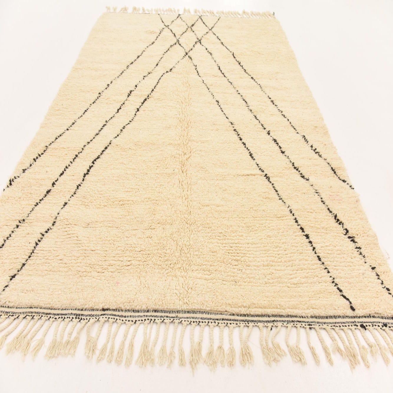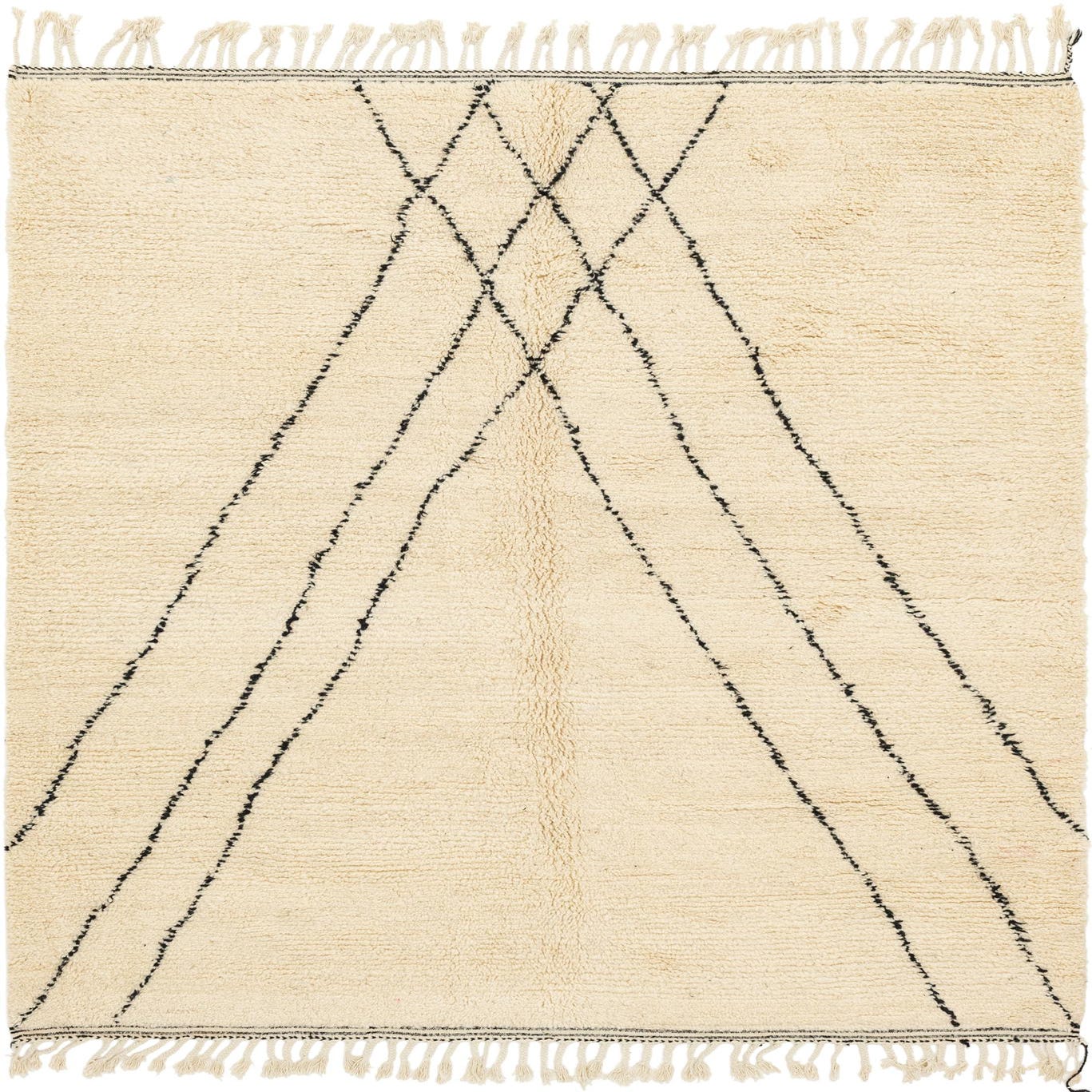 A 7x10 rectangular ivory shag rug with a bold black tribal geometric pattern and fringe, perfect for a modern living room.