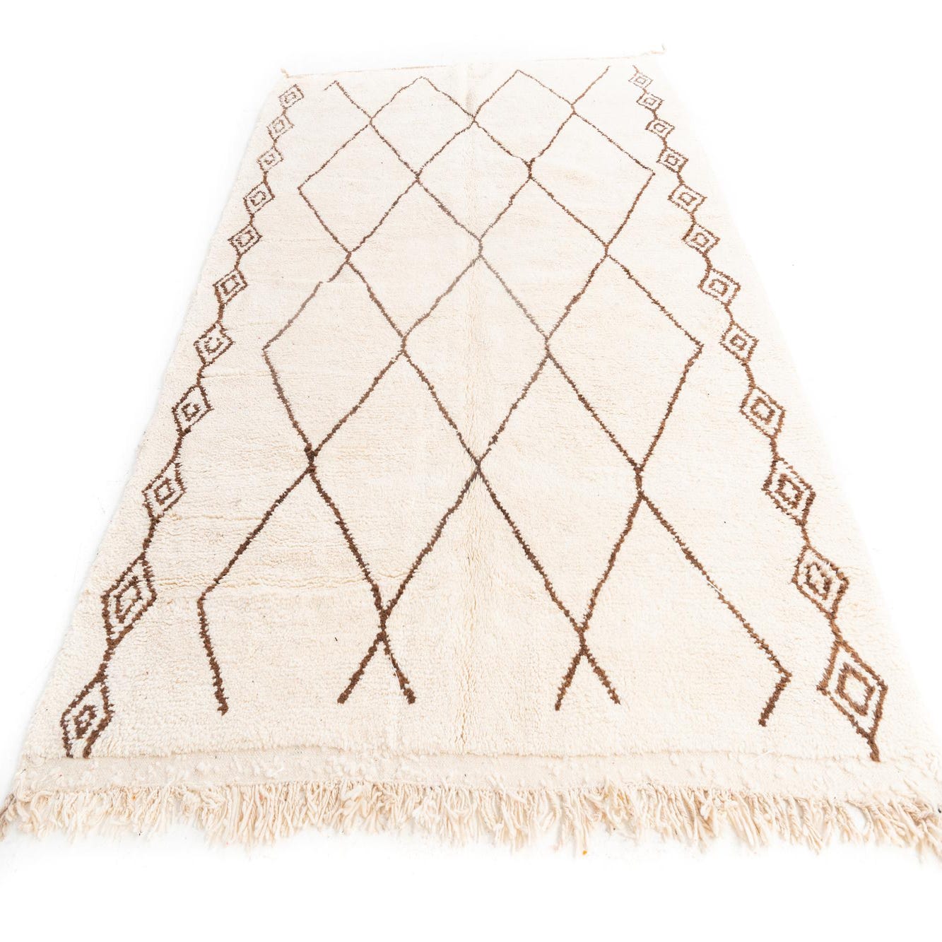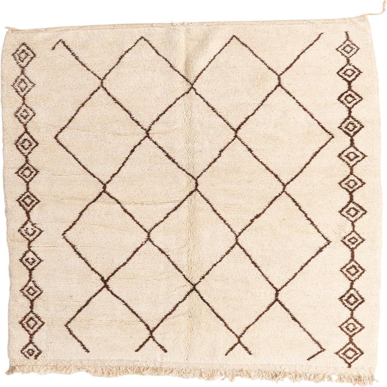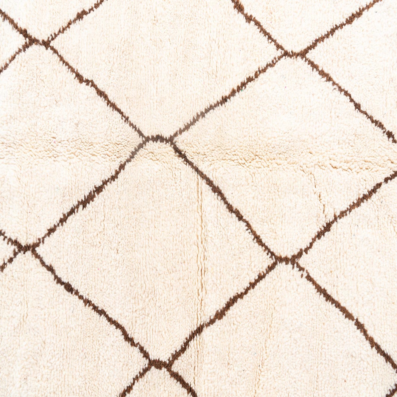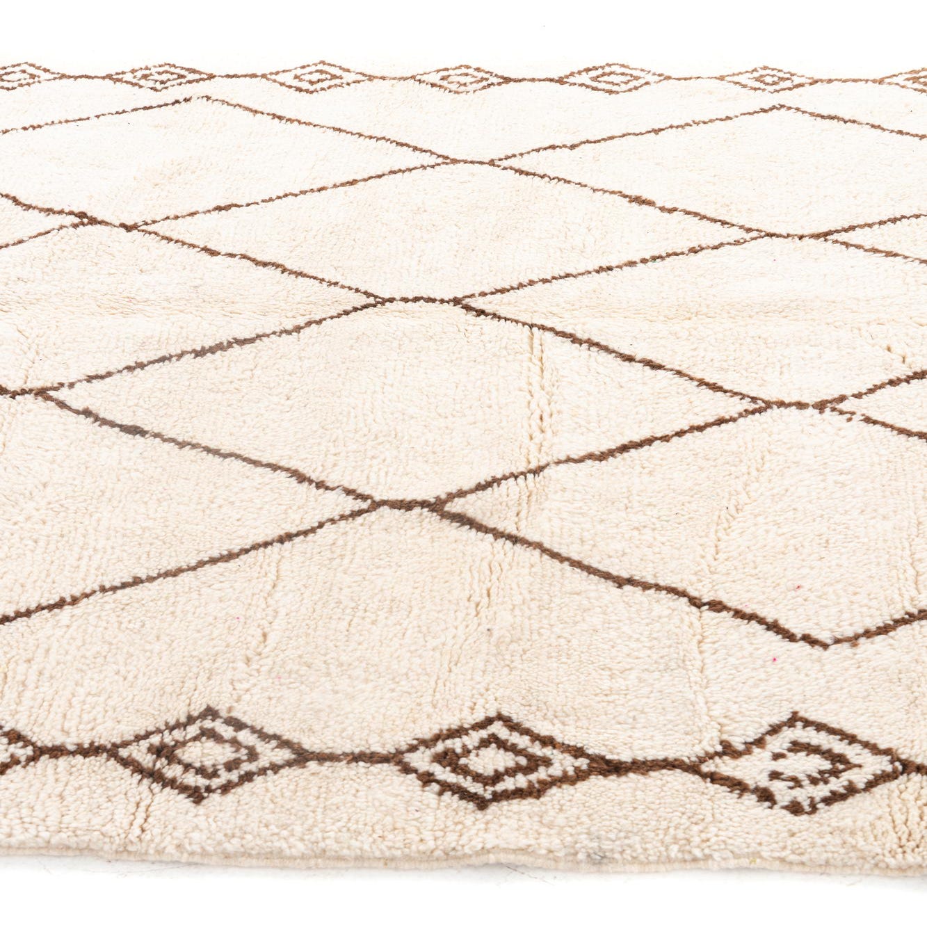 The Moroccan Collection offers a 7x10 hand-knotted rug that beautifully showcases its authenticity and craftsmanship. This piece features an ivory background with a minimalist pattern composed of brown geometric lines and motifs, creating a diamond lattice that is both timeless and distinctive. The simplicity of the design is complimented by its texture, correlating with the plushness and warmth that 100% wool provides. With a semi-antique age of 40-60 years, this rug not only adds visual interest but also a sense of history to any space it occupies.