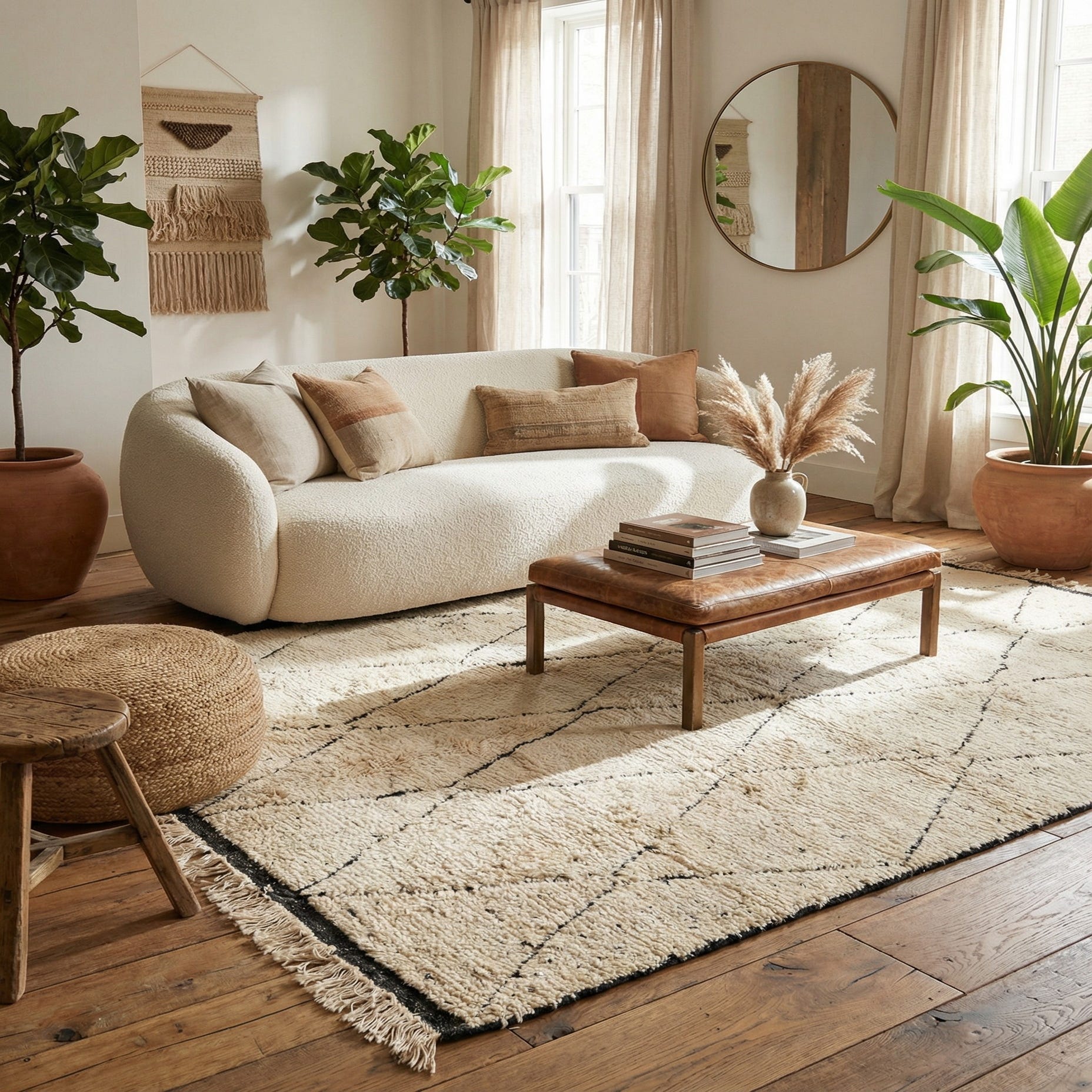 This rug works well as an anchor for a relaxed living room seating area, layered in a bedroom for added softness underfoot, or placed beneath a low-profile coffee table to introduce gentle pattern without competing with other finishes. Pair it with natural wood tones, matte black metals, and textured linens for a modern-bohemian or Scandinavian-inspired scheme, or use it to soften a minimalist space and add tactile contrast to smooth surfaces.