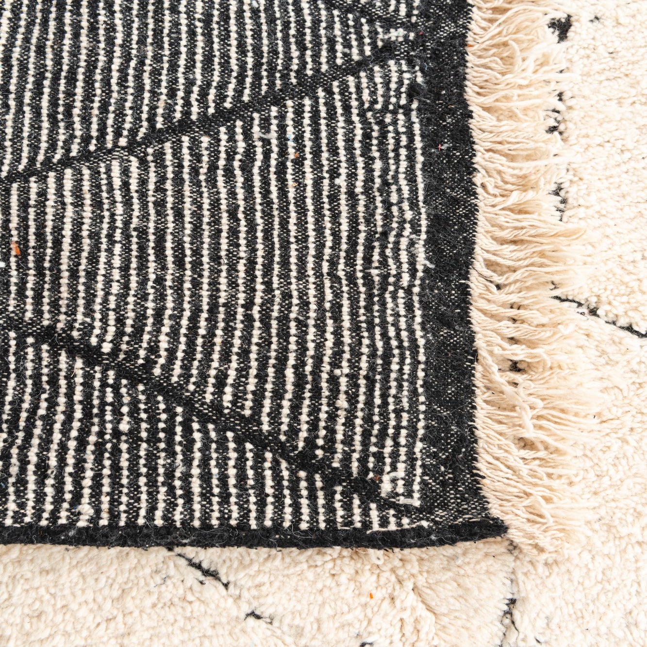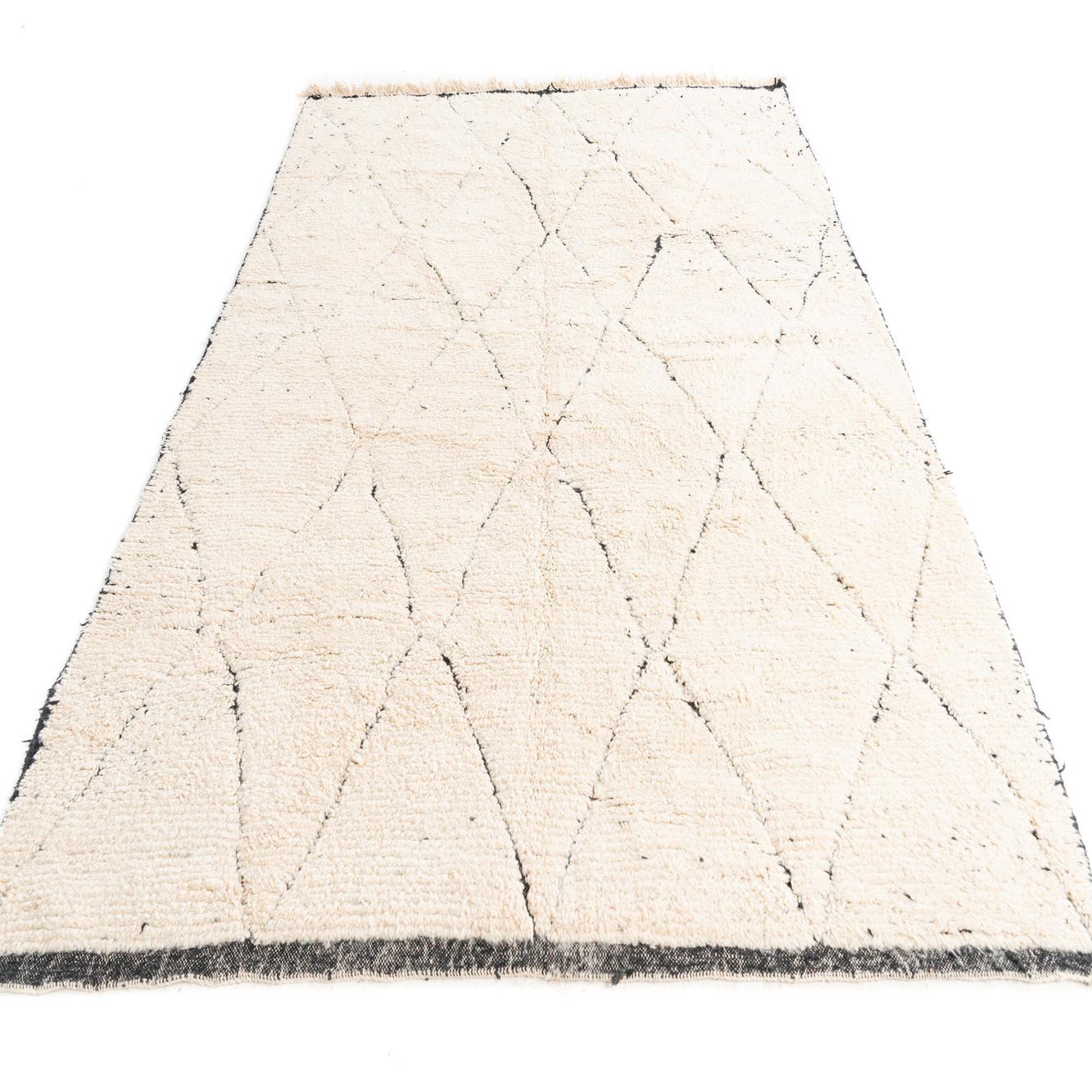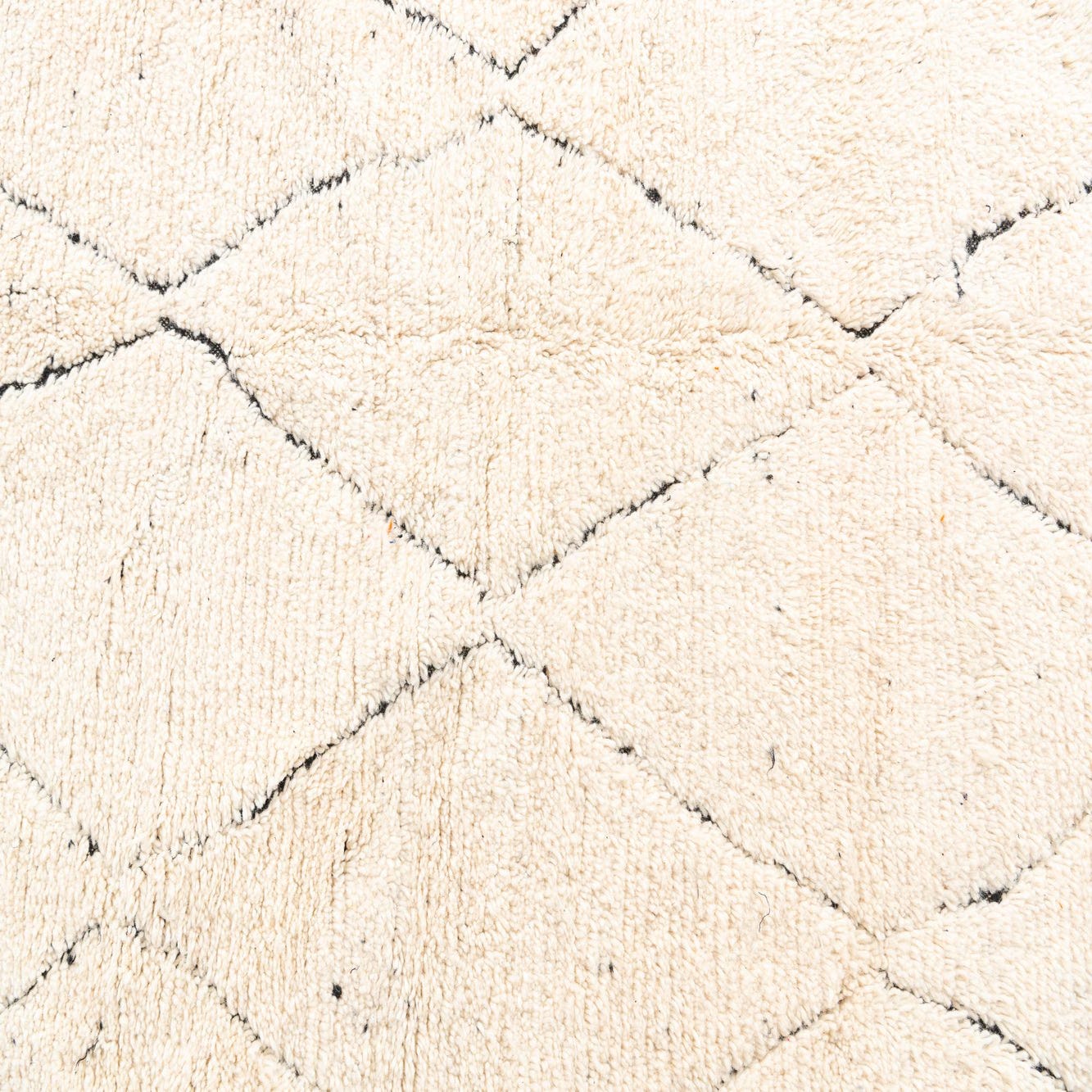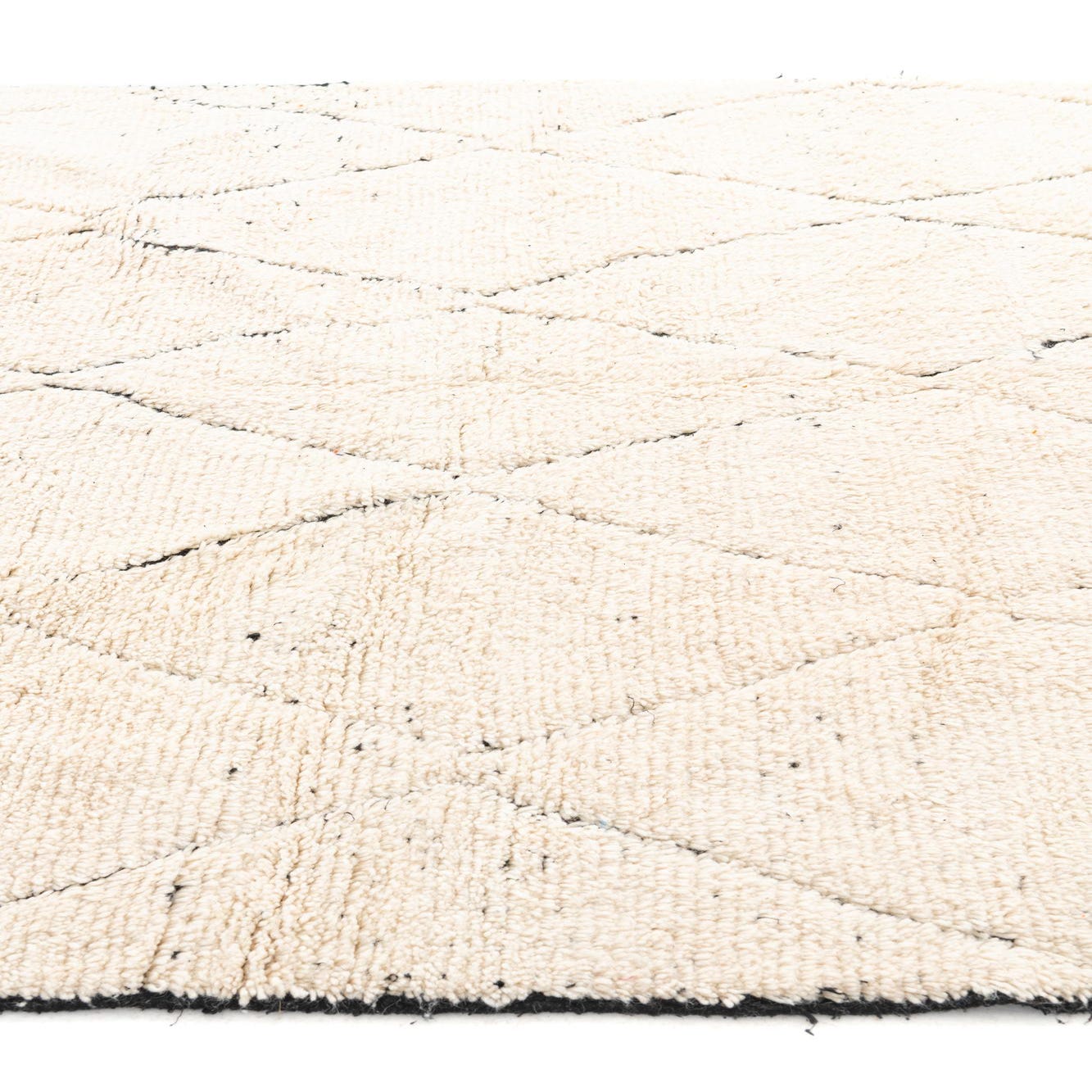 A warm ivory field forms the backdrop for a simple black diamond lattice that reads clean and organic. The hand-knotted 100% wool construction yields a dense, slightly plush pile with subtle pile-height variations and soft fringe at one end. Thin, hand-drawn black lines and tiny flecks of darker fiber give the pattern an authentic, lived-in character while the ivory ground keeps the overall look light and versatile.