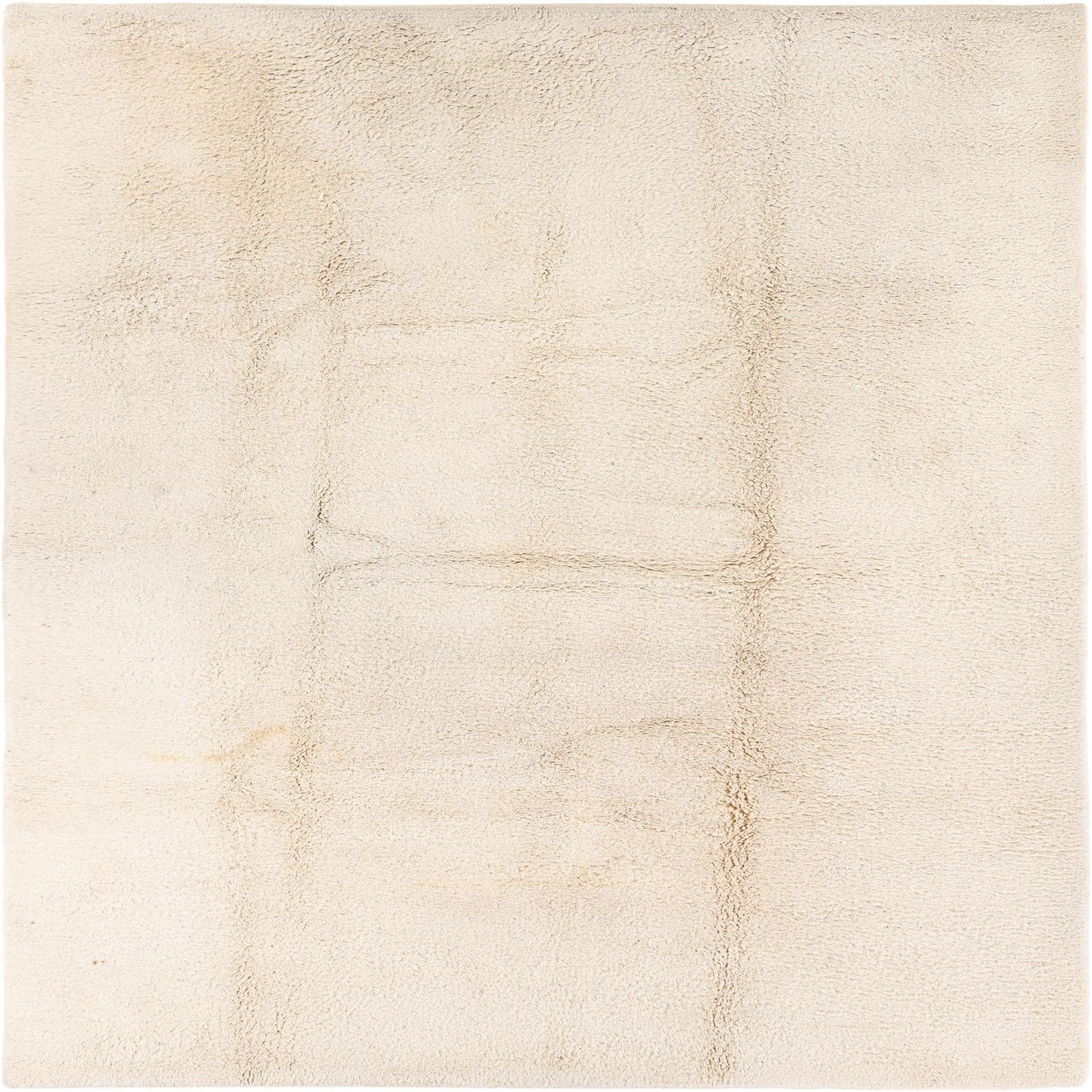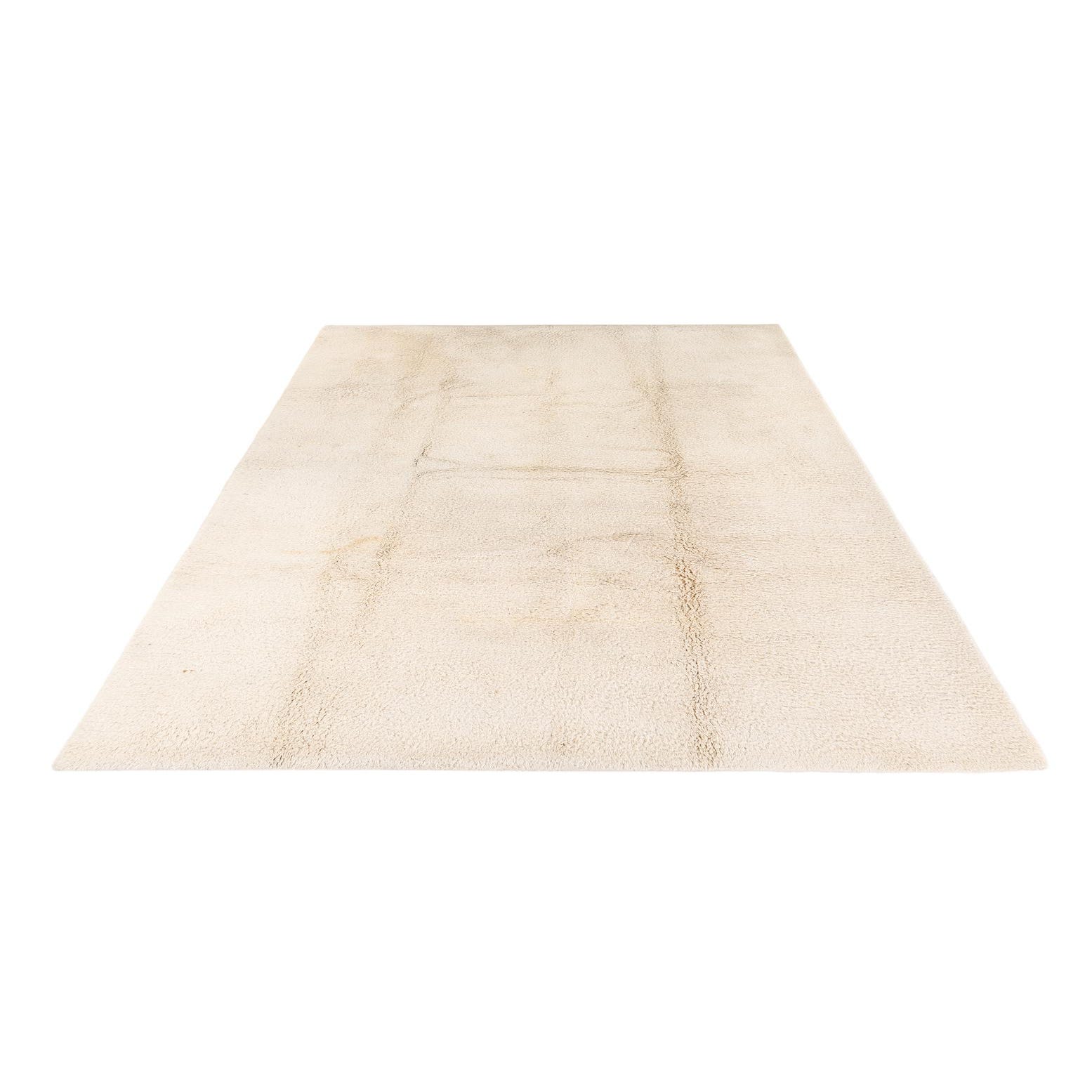 A soft ivory field is finished with a low-contrast, hand-drawn grid in warm beige tones, giving the rug a quietly geometric look that feels both modern and approachable. Hand-knotted from 100% wool, the pile is dense and plush underfoot with a slightly uneven, tactile surface that catches light and adds depth without overwhelming a room. The understated pattern provides visual interest while maintaining a neutral foundation.