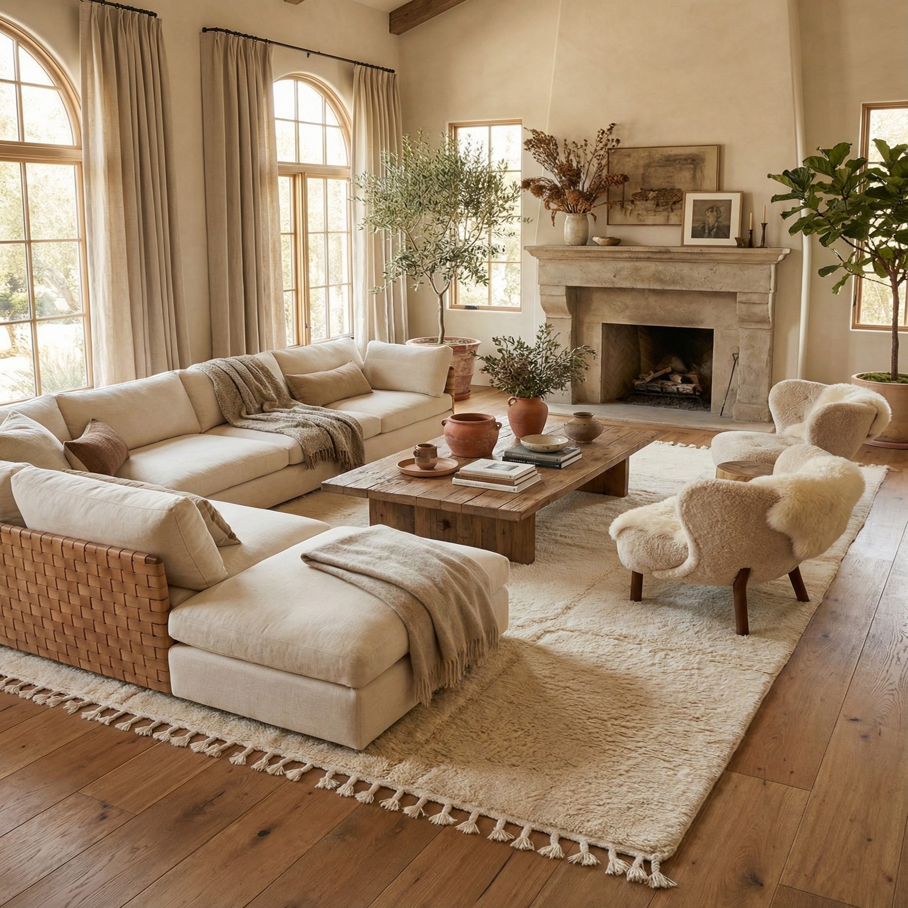 A 7x10 rectangular ivory shag rug with subtle tribal patterns and fringe, perfect for a modern living room.