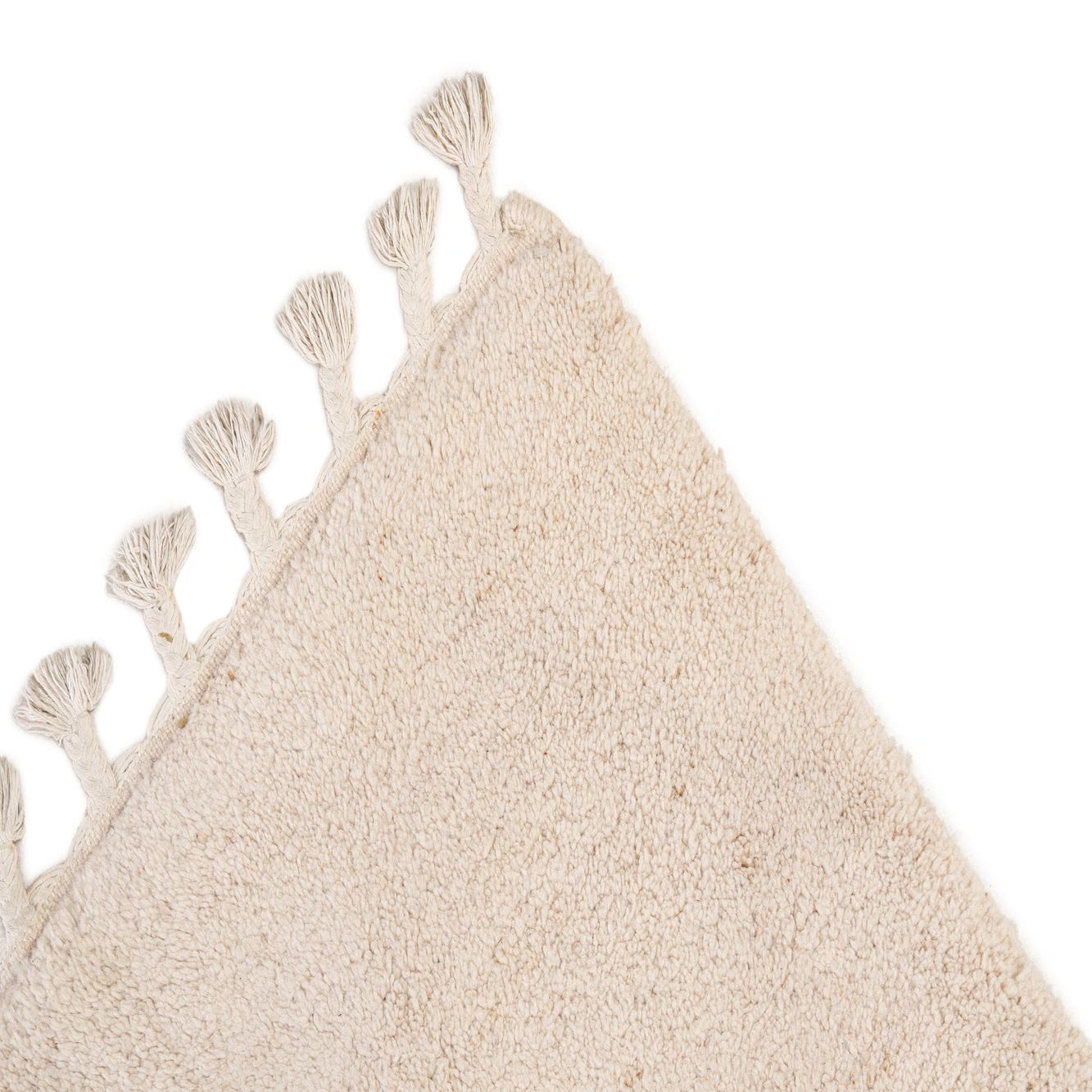 A 7x10 rectangular ivory shag rug with subtle tribal patterns and decorative tassels on the short ends, suitable for a living room.