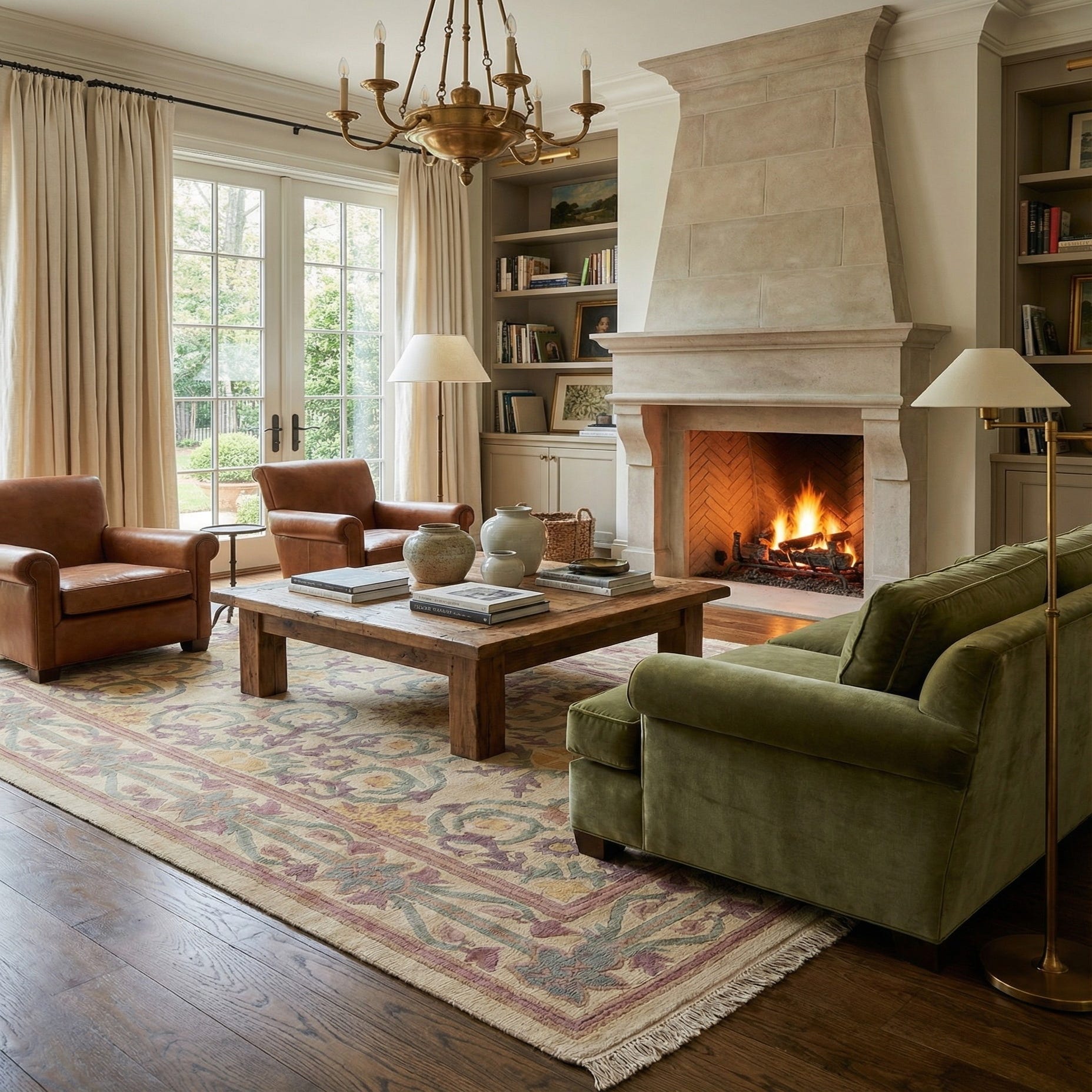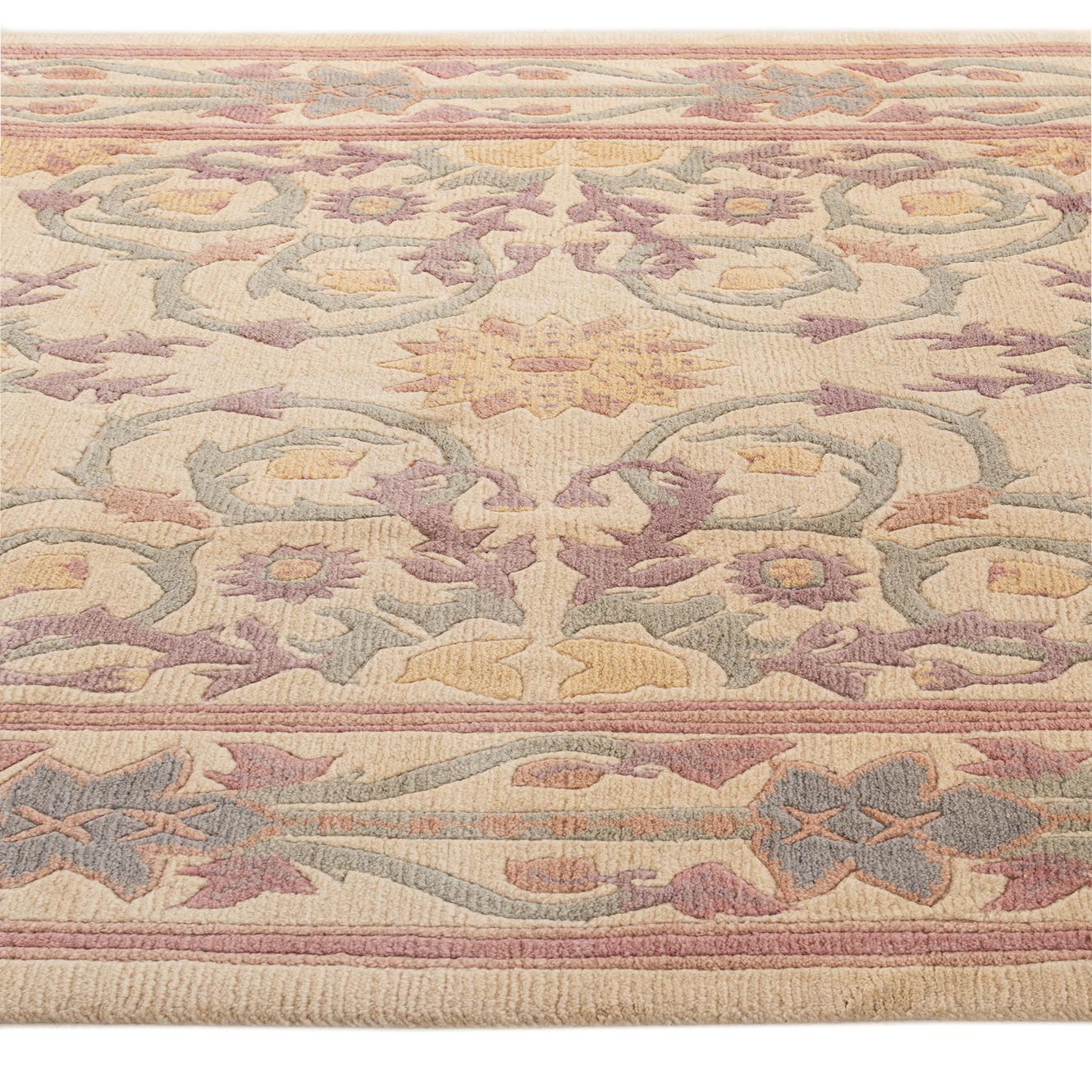 This versatile, vintage-inspired piece works well in a living room beneath a sofa and coffee table, layered in a bedroom to warm hardwood floors, or centered under a dining table to anchor seating. It pairs naturally with linen upholstery, pale painted furniture, warm wood tones and brushed metal accents, bringing a quiet floral elegance to traditional, cottage or transitional interiors.