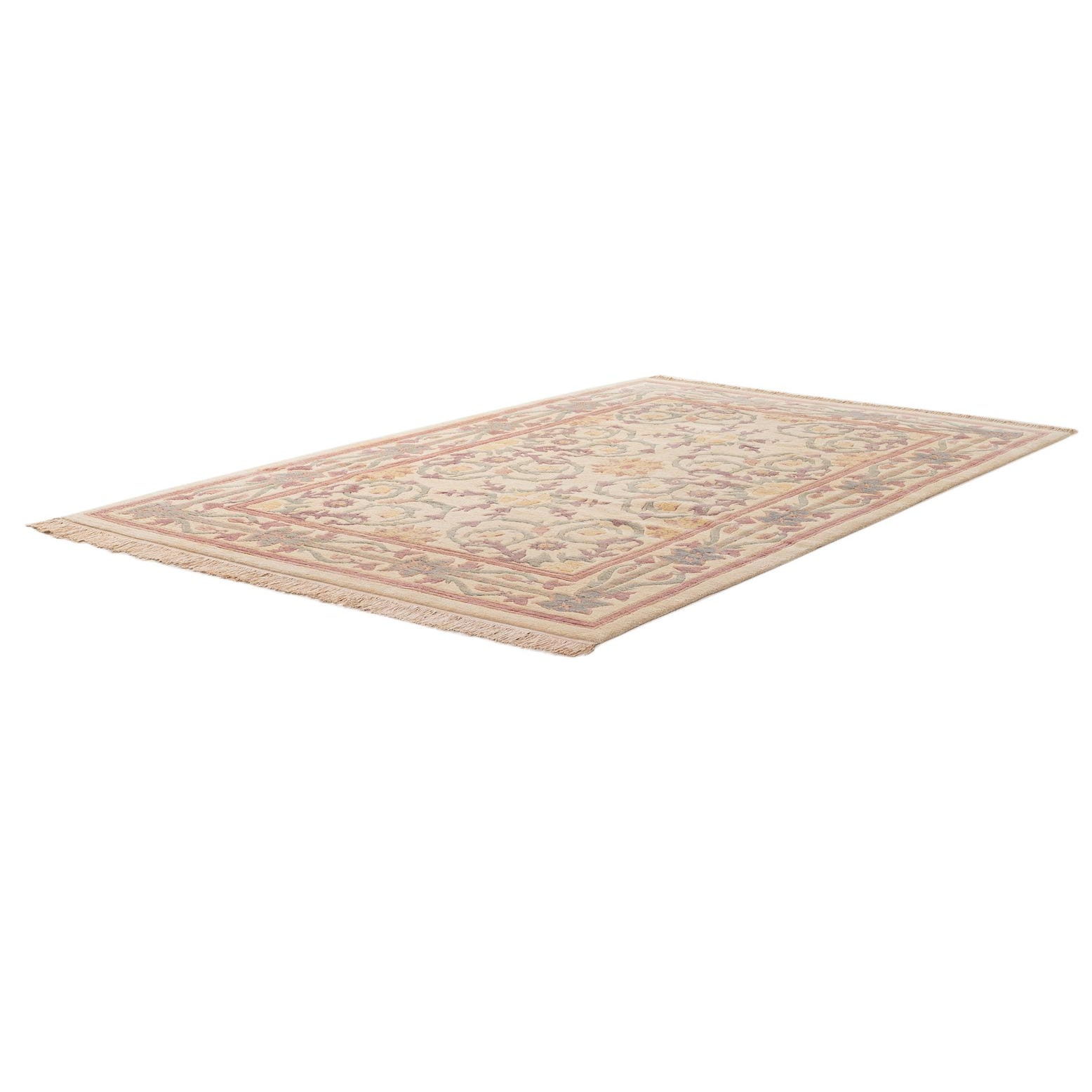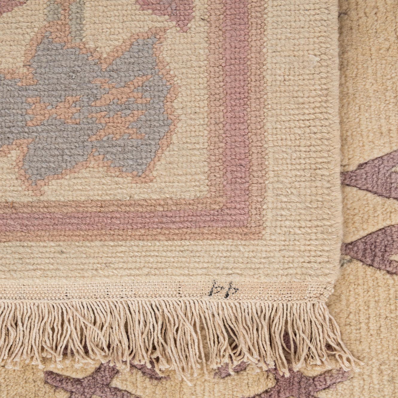 Hand-knotted in 100% wool, this rug presents a soft ivory field patterned with scrolling floral vines and a framed floral border. The design combines stylized medallions and looping arabesques in a muted palette of violet, light blue, light green, yellow and pink, with a short fringed finish at each end. The wool pile is pleasantly soft underfoot with a low-to-medium profile and subtle tonal variation from the hand-knotting that gives the surface gentle depth and texture.