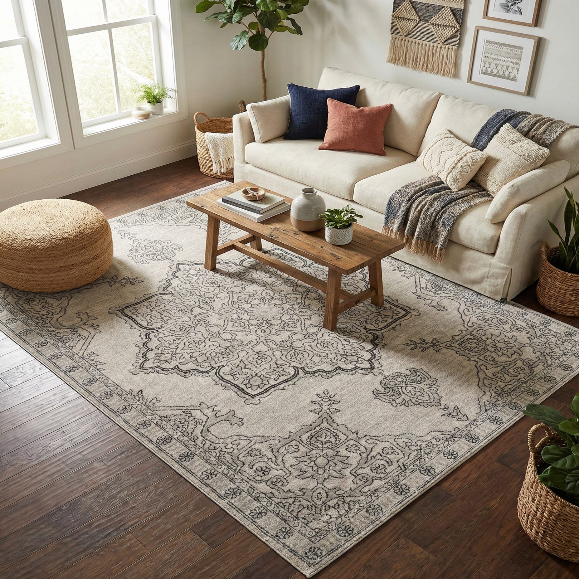 A classic medallion anchors this rug, surrounded by delicate floral arabesques and corner spandrels for a refined, Persian-inspired profile. The ivory background creates an airy, neutral field while fine black and gray lines trace the detailed motifs and narrow border, offering crisp contrast without overpowering a room. Machine-made from 100% polypropylene, the rug has a low, smooth pile that feels soft underfoot and a gently aged finish that adds subtle character.