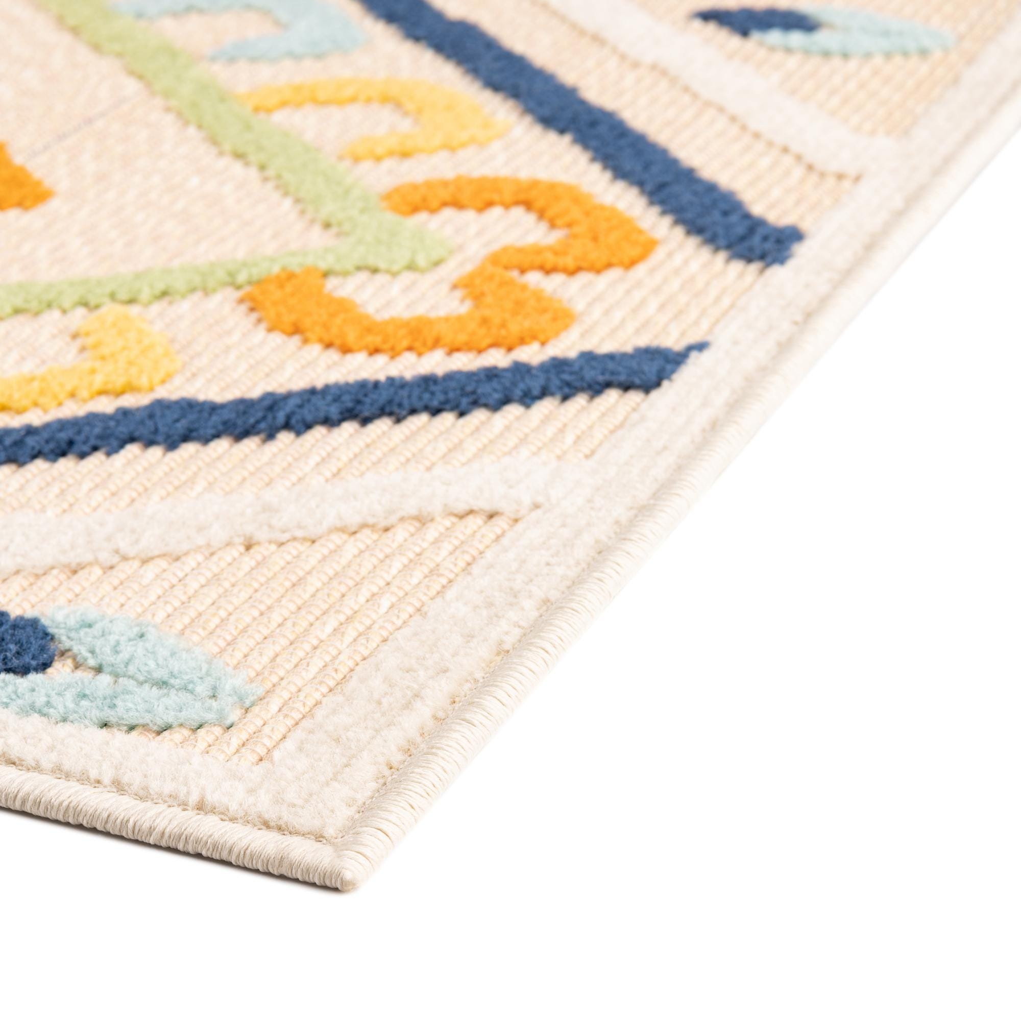 A 7x10 rectangular ivory flatweave rug with a modern geometric pattern in navy, orange, green, yellow, and pink.