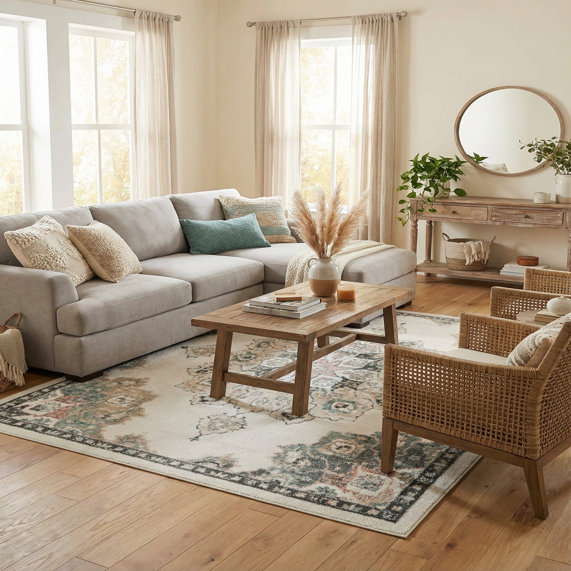 A 7x10 rectangular ivory rug with a faded traditional medallion pattern in muted tones of cream, beige, grey, and light blue.