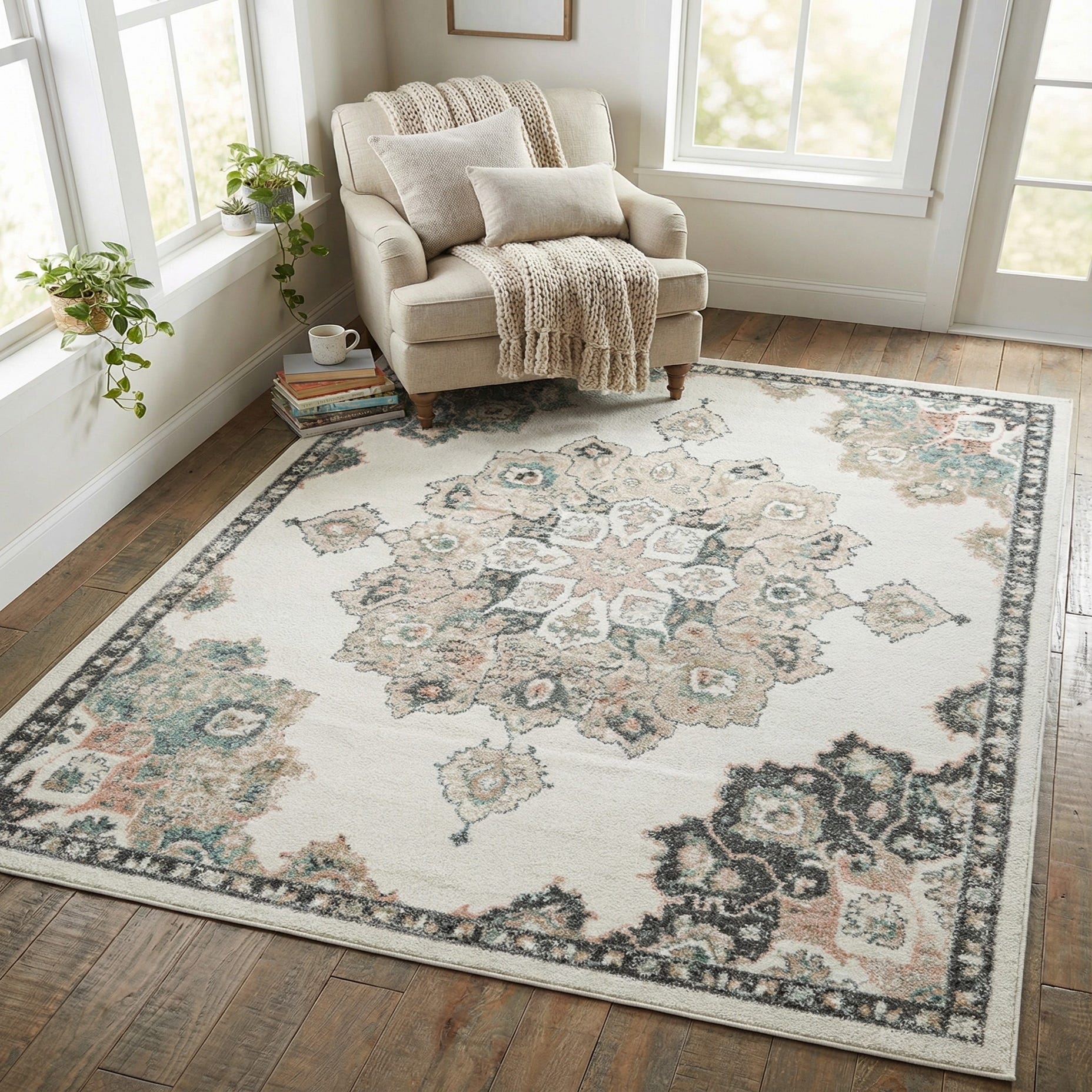 A soft, low-pile rug with a classic medallion motif and a gently distressed finish, this piece combines traditional patterning with a relaxed, lived-in look. The ivory background keeps the palette light and open, while layered details in beige and black define the central medallion and corner flourishes. Delicate pink accents are woven into the design, adding a subtle warmth without overpowering the neutral base. Running along the edge is a narrow, worn-looking border that frames the composition and enhances the antique-inspired character. The surface feels soft and dense underfoot, with a smooth, even texture typical of machine-made construction.