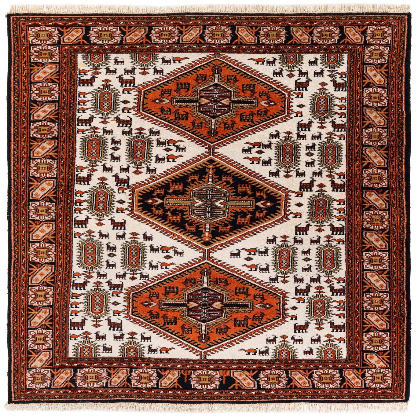 Primary color is Ivory. Colors in this rug include: Ivory, Black, Brown, Olive, Orange, Green.