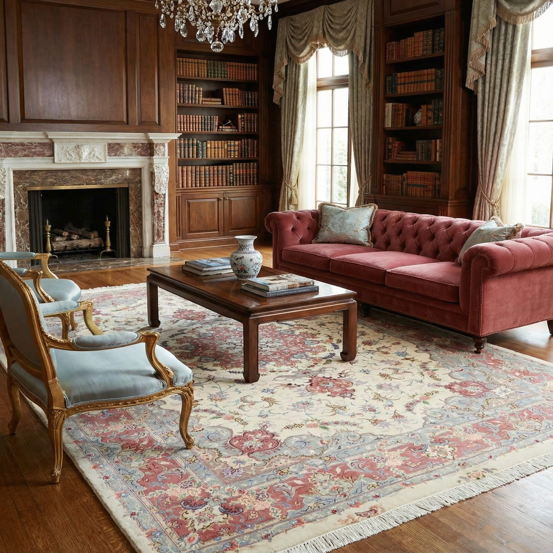Suitable for a range of interior design scenarios, this rug could serve as a stately anchor in a formal living room or dining area, enhancing both contemporary and traditional decors. Its diverse color scheme allows it to interface seamlessly with a variety of furniture finishes and room palettes, making it a versatile choice for designers looking to imbue a space with both warmth and sophistication.