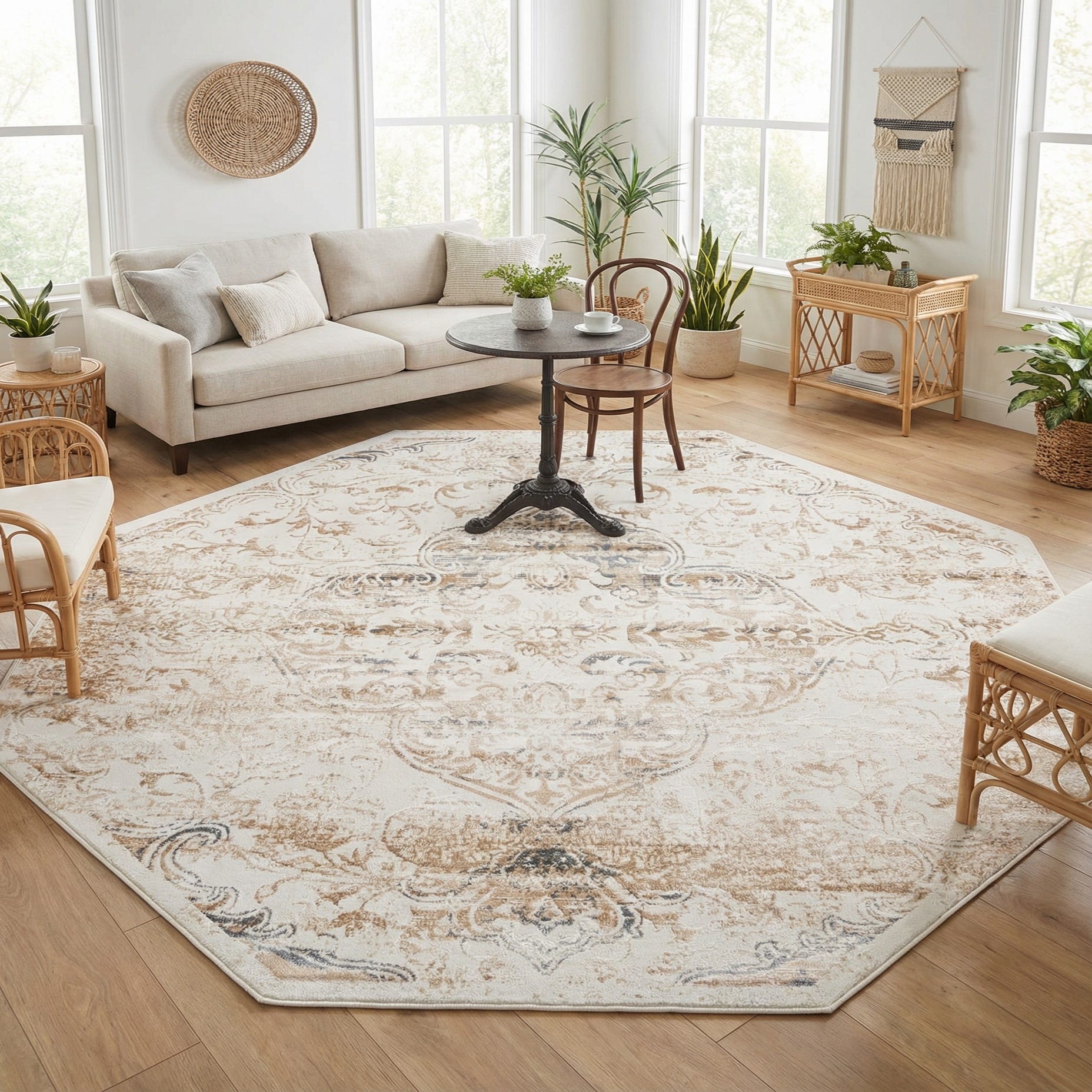 The octagonal shape gives this rug a distinctive footprint that works well in a variety of spaces: center it beneath a round dining table, anchor a cozy seating vignette, or place it in an entry or foyer to make a refined first impression. Pair it with warm wood tones and linen upholstery for a relaxed transitional scheme, add brass or matte black accents for a more refined look, or layer it over wider-plank flooring in a farmhouse or coastal-inspired room to soften the space while keeping the palette light and airy.