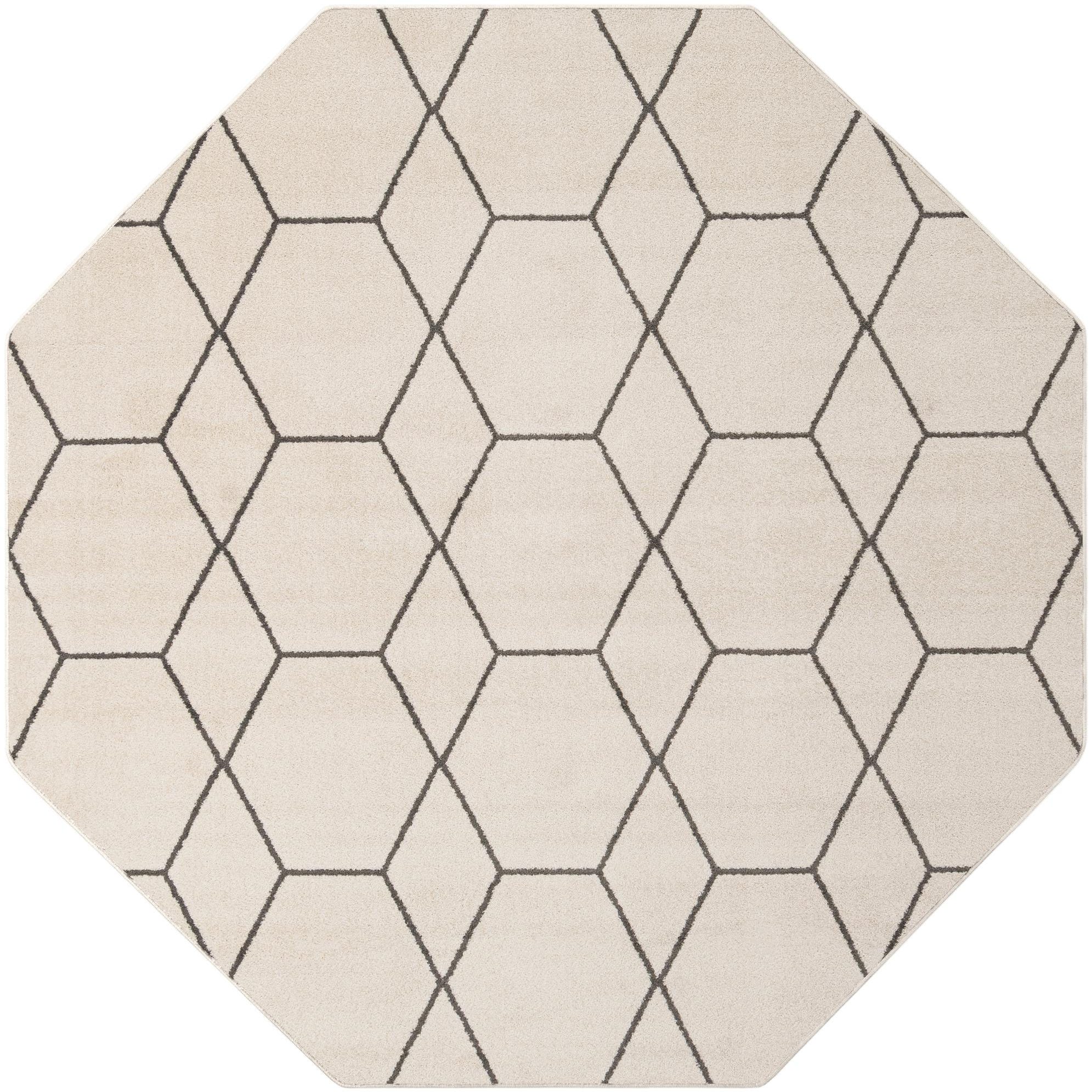 A crisp geometric lattice of gray lines crosses an ivory field to form an interlocking hexagon motif with clean, modern lines. The octagonal shape adds visual interest while keeping the design restrained and architectural. Machine-made from 100% polypropylene, the surface has a low, dense pile that feels soft underfoot yet holds its structure, giving the pattern a slightly raised, tactile quality you can notice when you run your hand across it.
