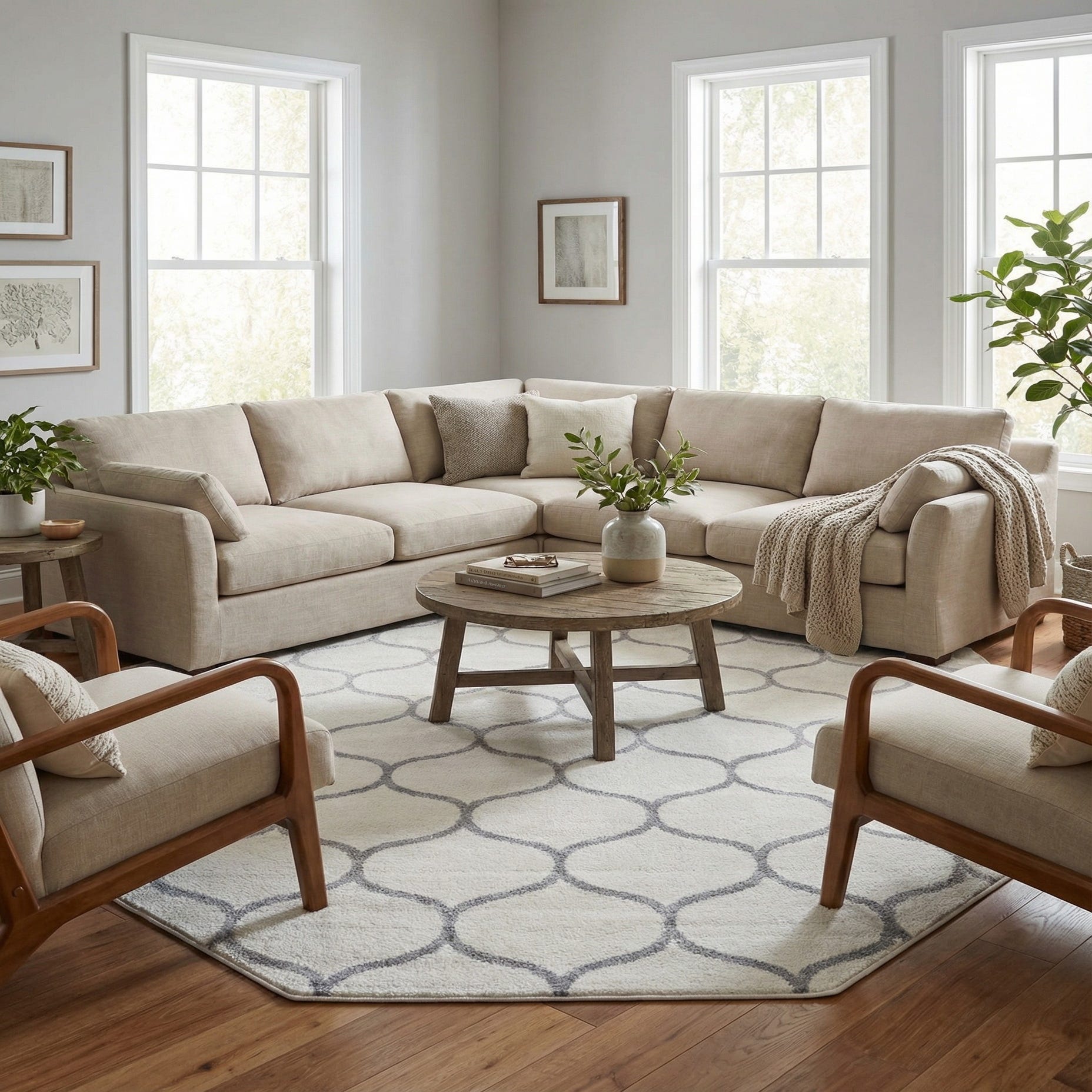 The octagonal silhouette adds architectural interest and works particularly well beneath a round dining table, in a foyer, or centered in a seating nook to define the space. Pair it with light woods, cool-toned upholstery, and matte metal accents for a contemporary or transitional scheme, or use it to soften a minimalist, Scandinavian, or coastal palette.