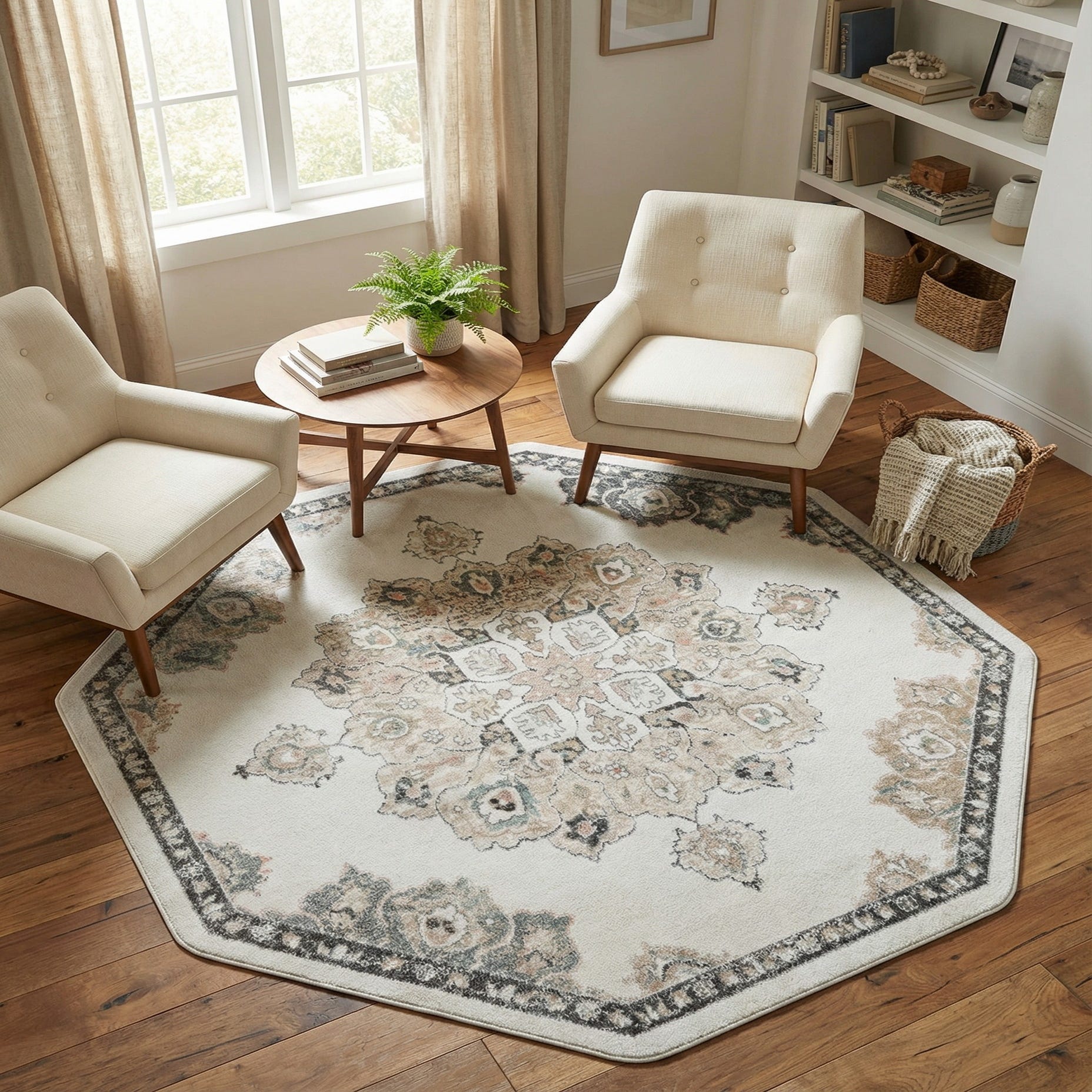 An octagonal floor piece with a classic medallion layout, this rug pairs traditional motifs with a softly faded, vintage-inspired finish. The ivory field provides a clean, airy backdrop for layered floral and arabesque elements rendered in beige and muted pink, while black outlines add definition and subtle contrast. Machine made of 100% polypropylene, the surface has a low, dense pile that feels smooth and slightly plush underfoot, offering a comfortable texture without excess thickness.