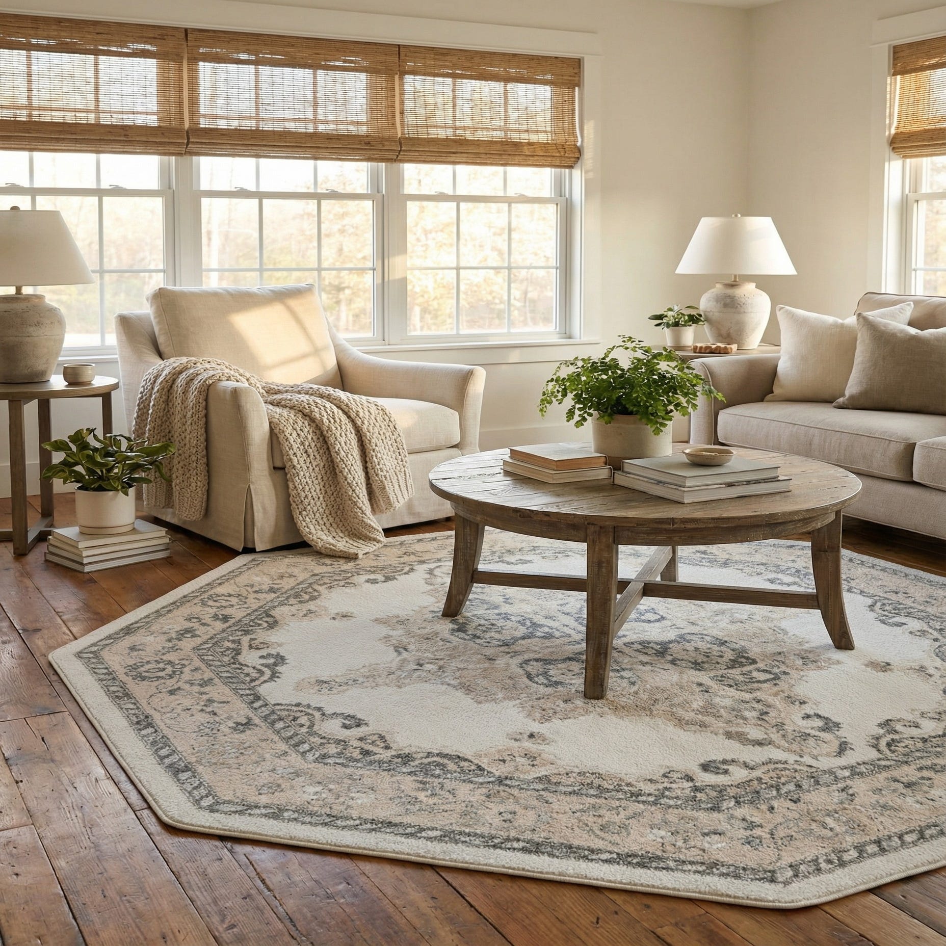 An octagonal ivory and cream rug with a traditional botanical medallion pattern in shades of gray and beige.
