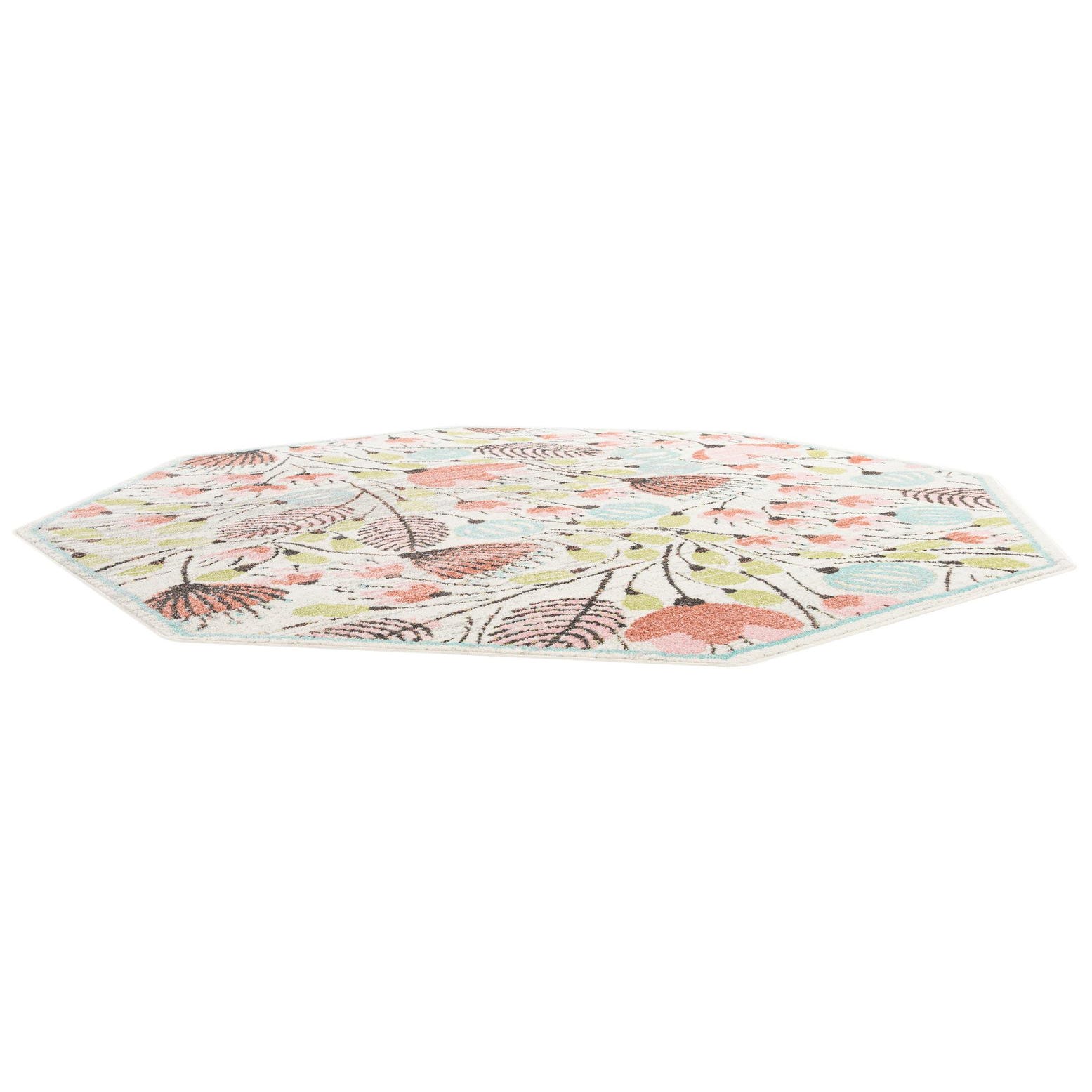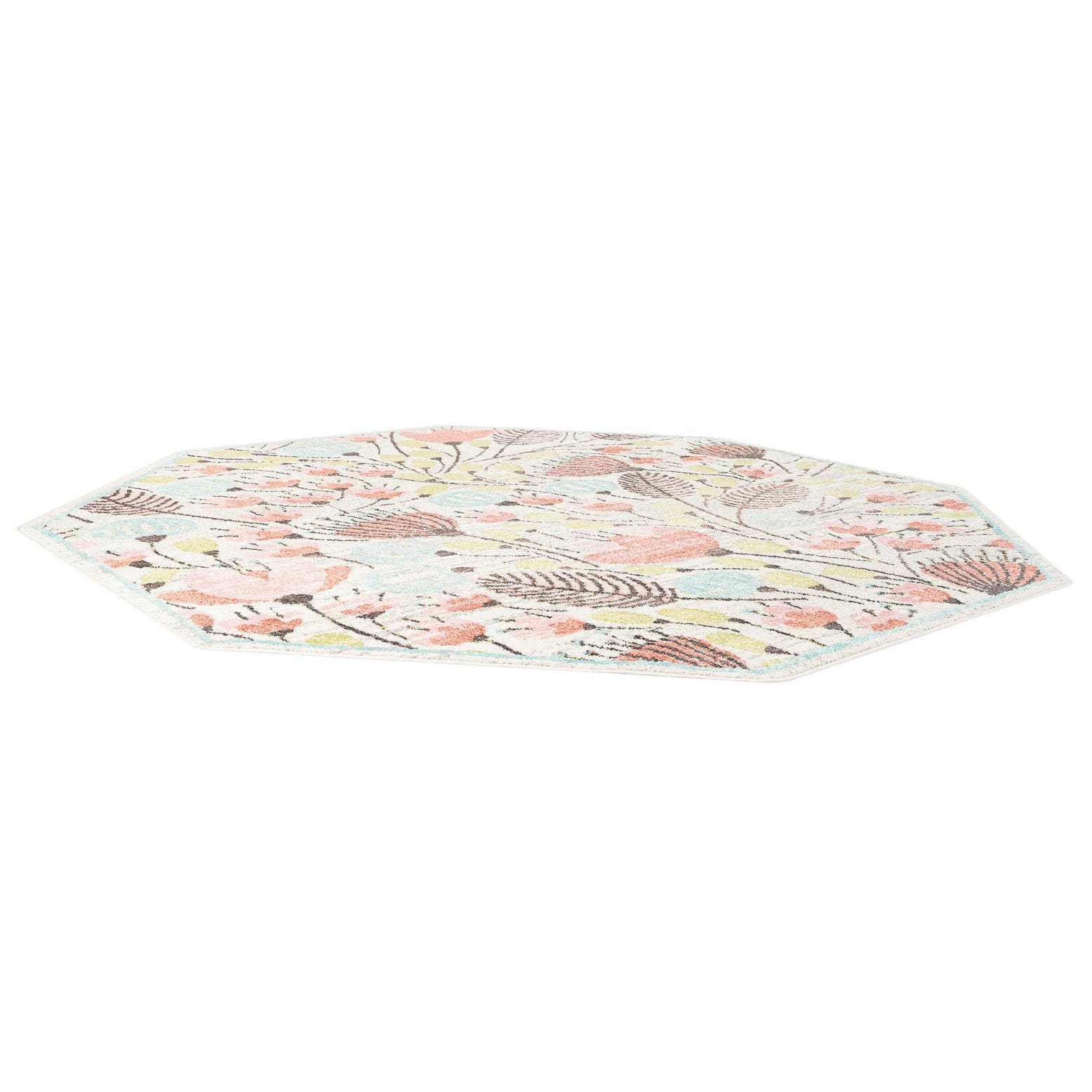 An ivory octagon rug with a modern floral pattern in shades of pink, blue, green, and coral, perfect for a child's room.