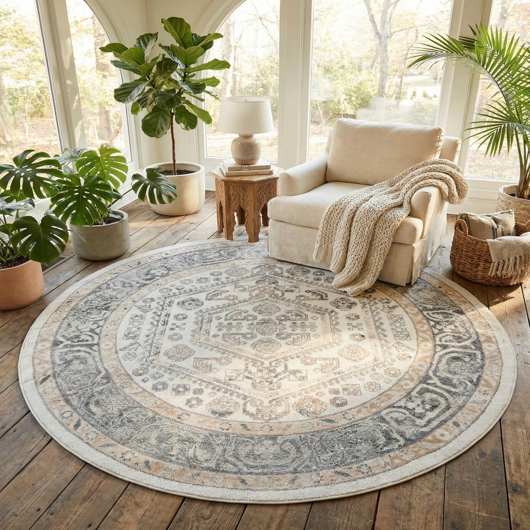 A softened medallion pattern sits at the center of this round rug, framed by concentric borders that carry stylized floral and geometric motifs. The background is ivory, while beige highlights lend warmth and gray and black accents create gentle contrast and definition. The overall finish has a subtly faded, vintage-inspired look that balances traditional ornament with a relaxed, modern sensibility.