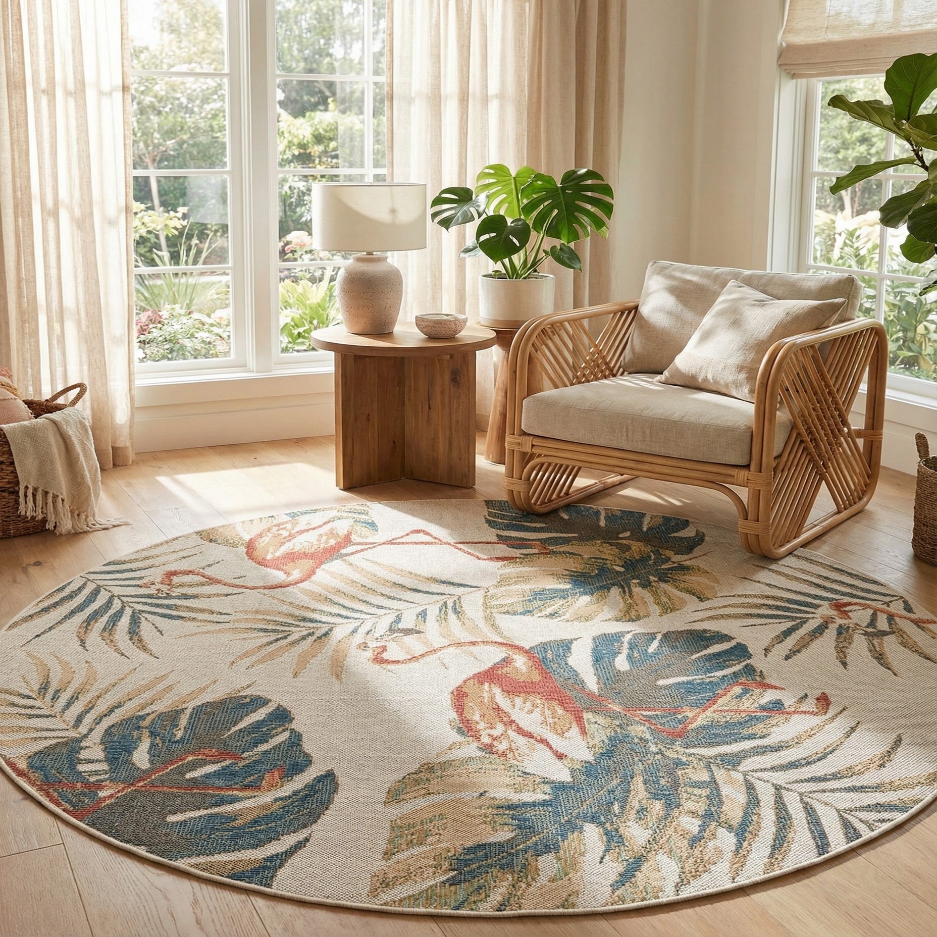 Round ivory rug with a vibrant tropical pattern featuring orange flamingos and large green and blue palm leaves.