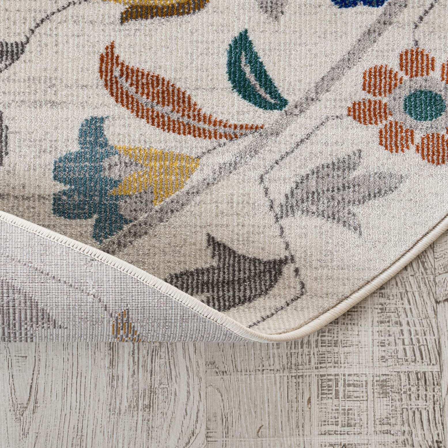 Primary color is Ivory. Colors in this rug include: Ivory, Blue, Gray, Green, Rust Red, Yellow.