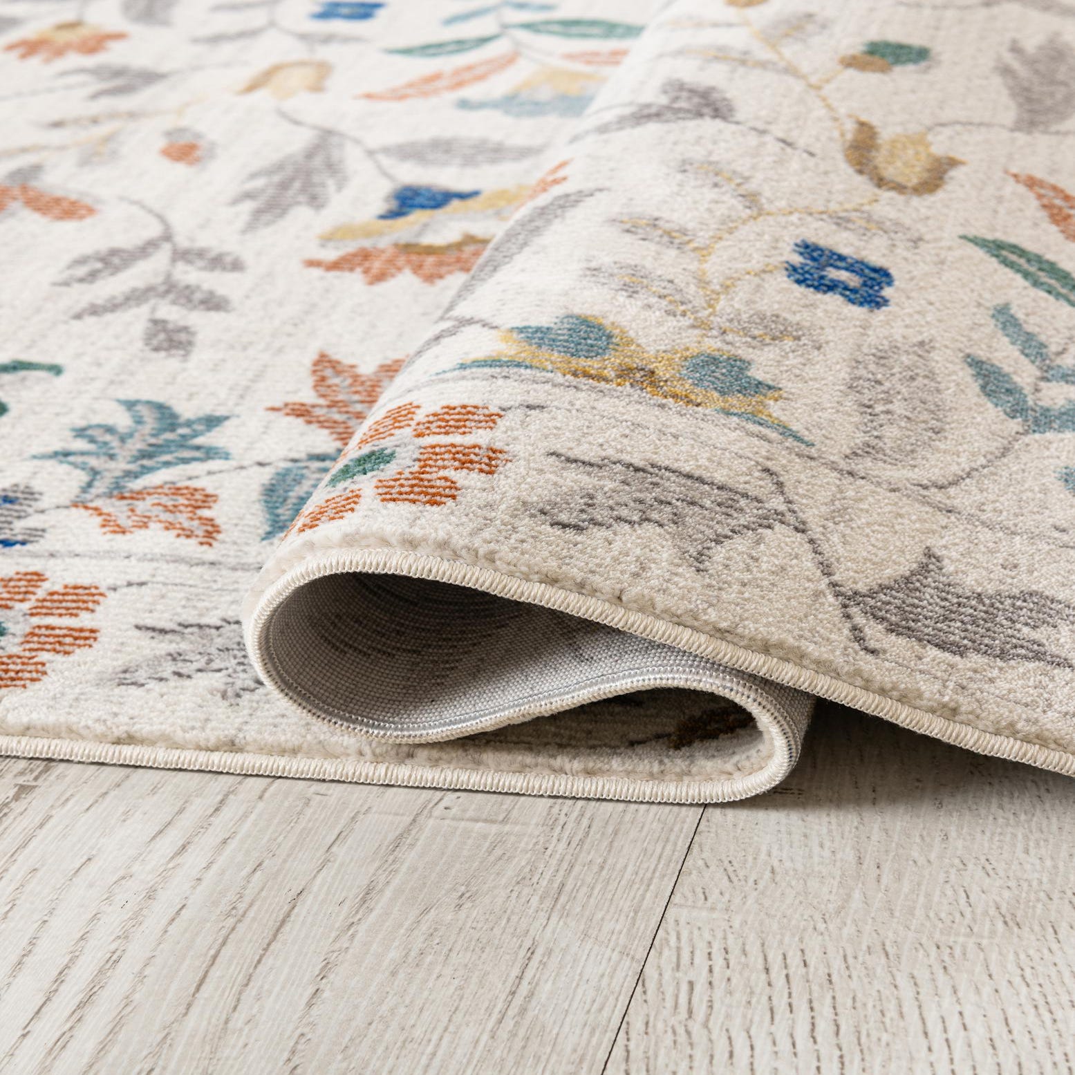 Primary color is Ivory. Colors in this rug include: Ivory, Blue, Gray, Green, Rust Red, Yellow.