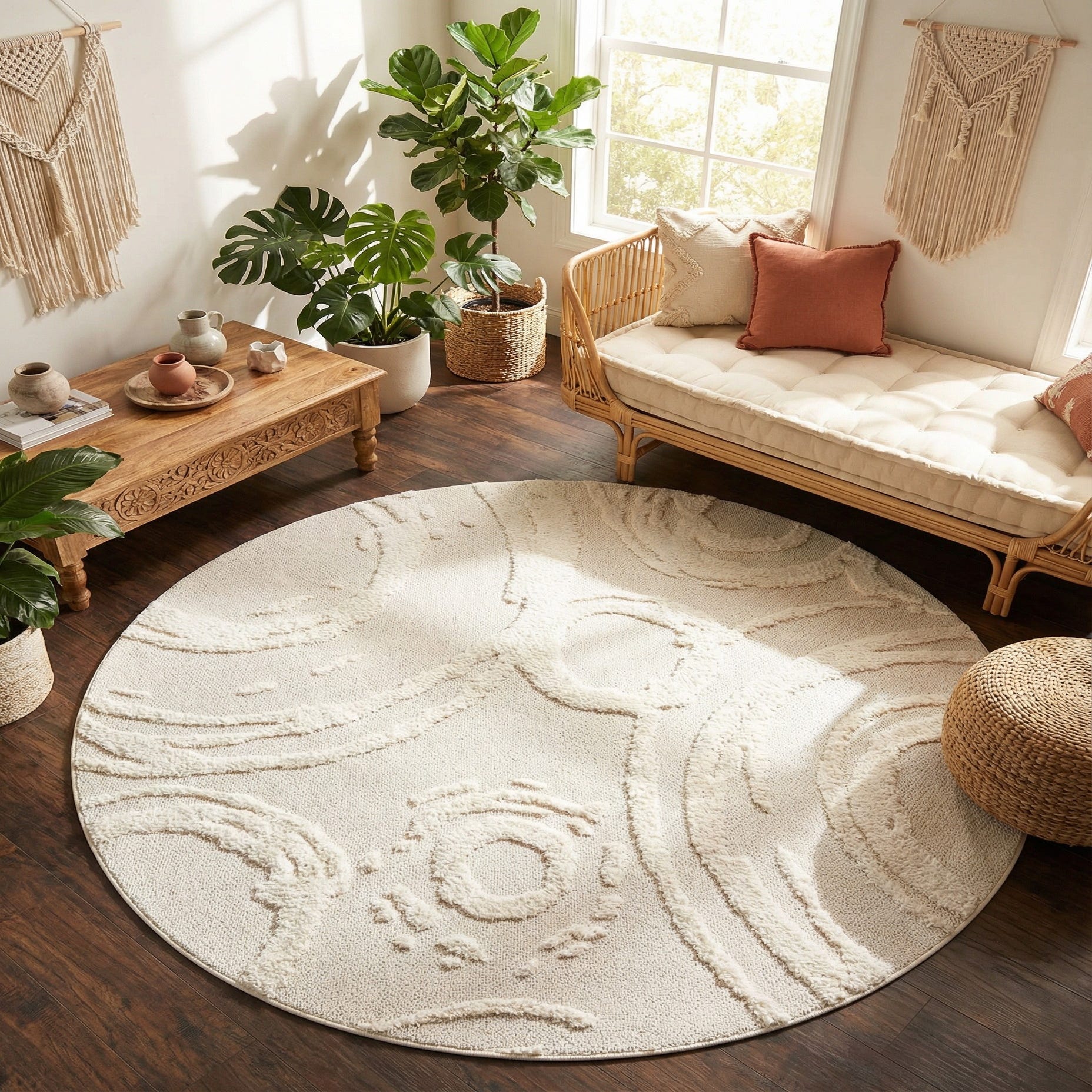 This round rug anchors seating arrangements, works beautifully beneath a round dining table, or creates a cozy focal point in a bedroom or reading nook. It pairs naturally with light woods, linen upholstery and woven accents for a relaxed, modern-bohemian or coastal-inspired interior, and also layers well with neutral textiles to add subtle depth without competing with existing patterns.