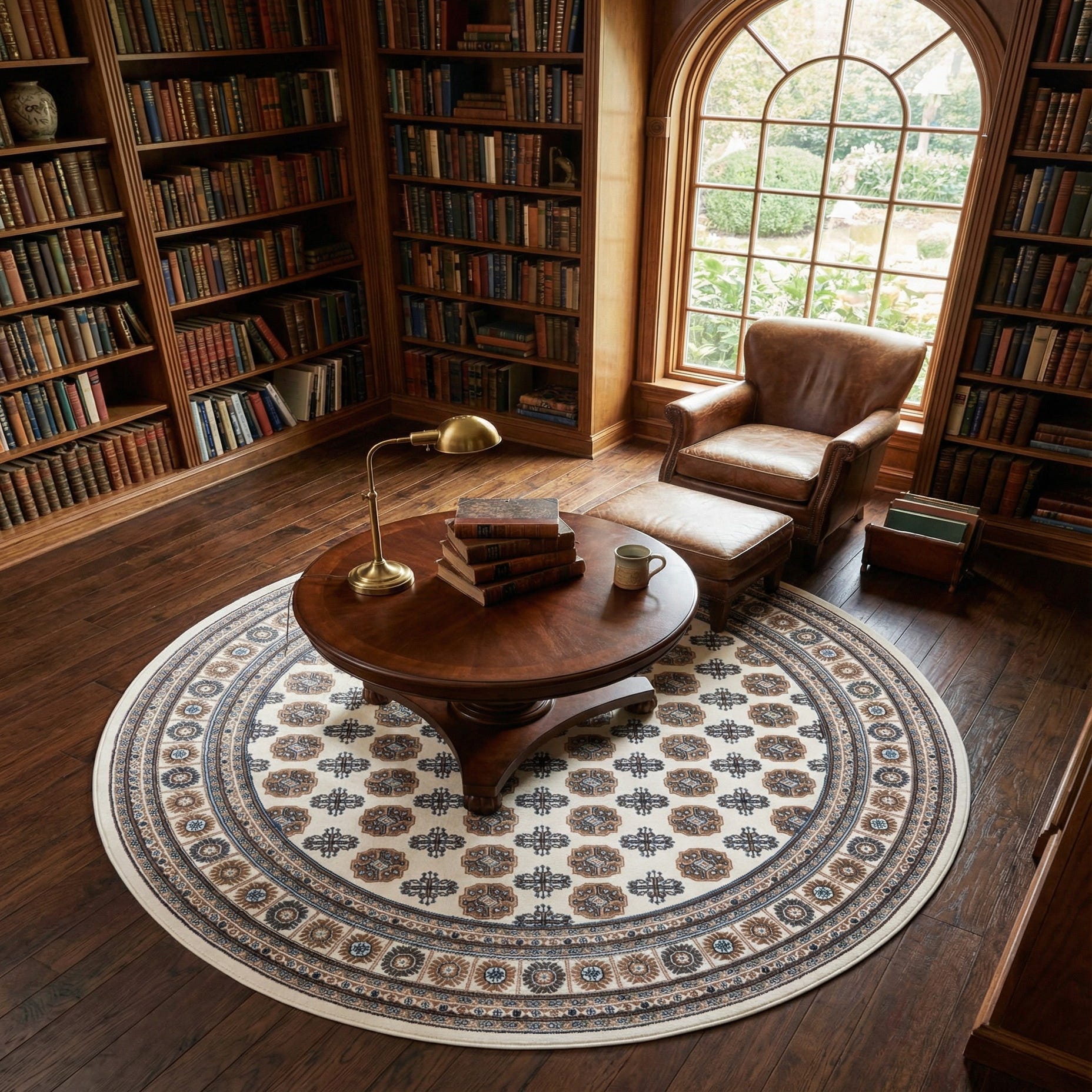 Primary color is Ivory. Colors in this rug include: Ivory, Light Brown, Navy Blue.