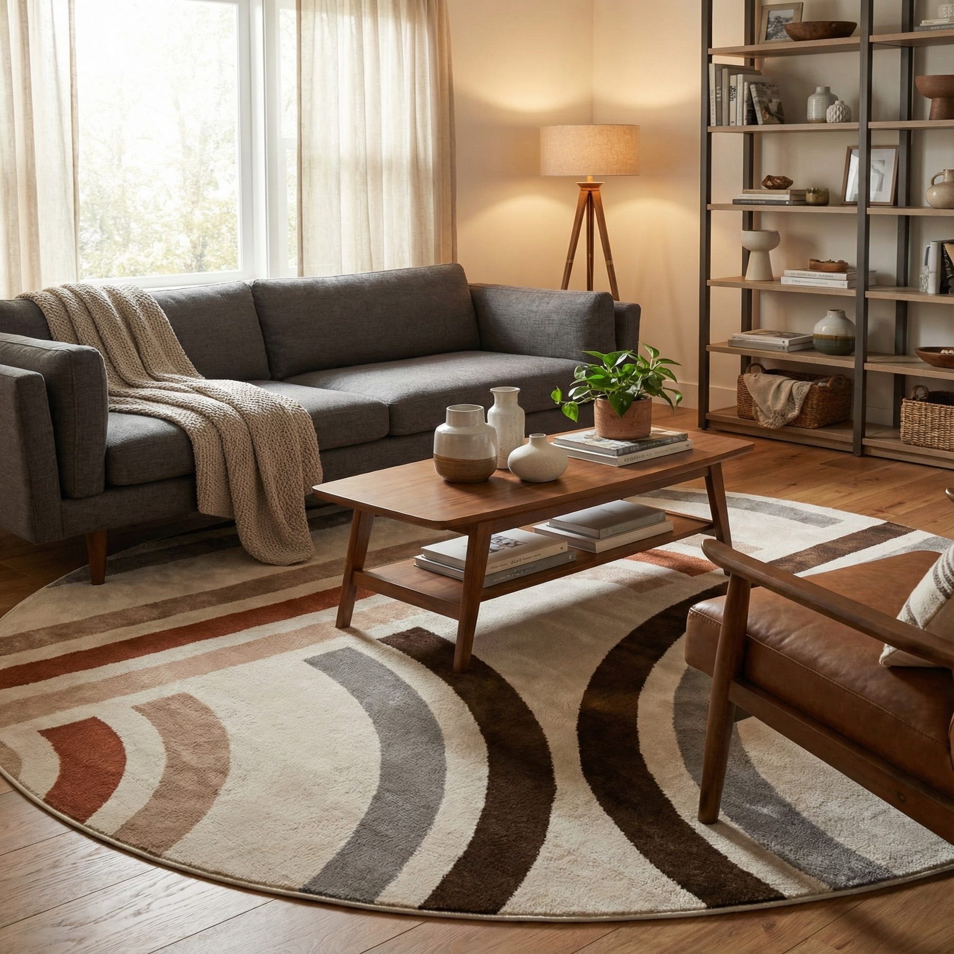 A round ivory rug with a modern abstract pattern of curved lines in shades of brown, gray, and rust.