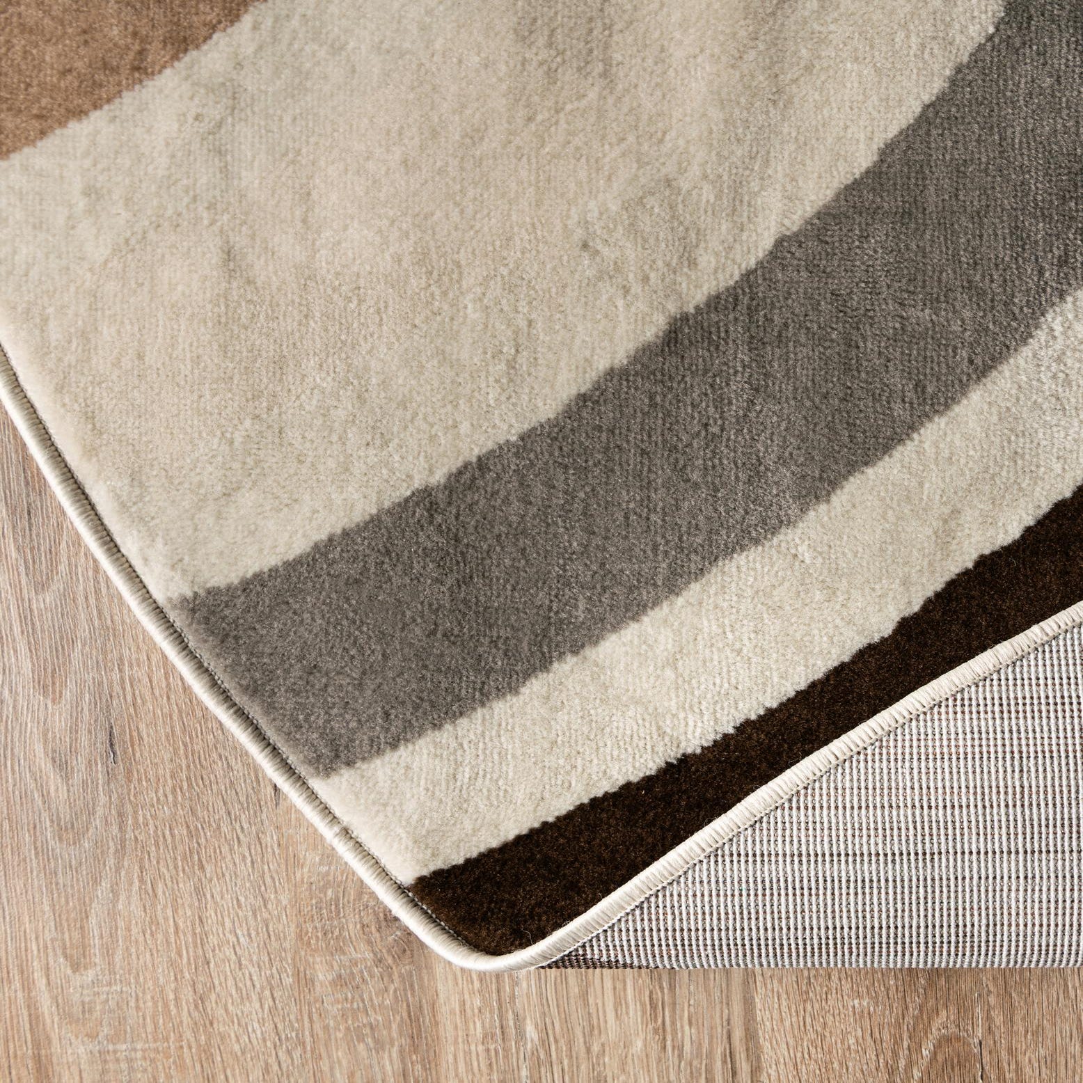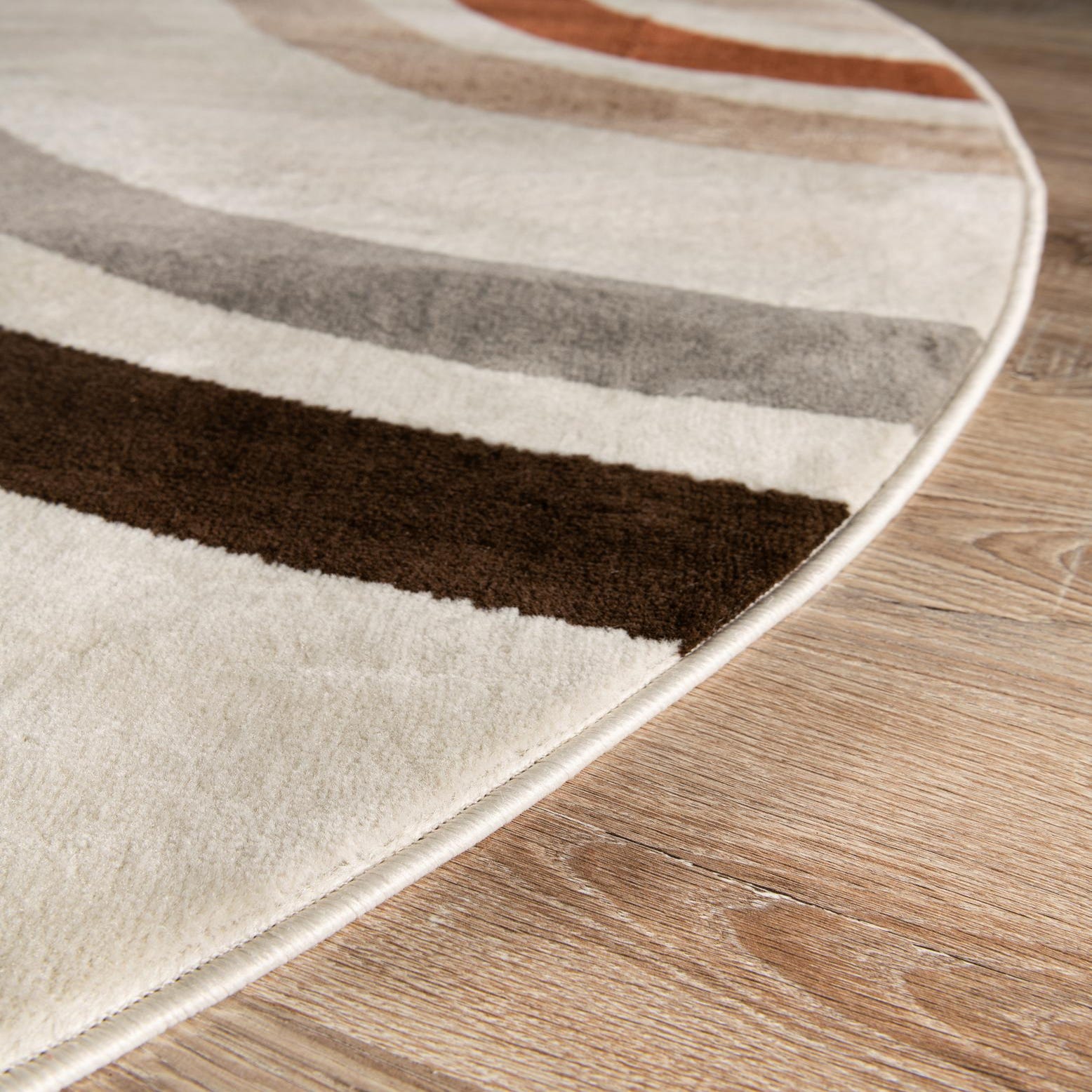 A round ivory rug with a modern abstract pattern of curved lines in shades of brown, gray, and rust.