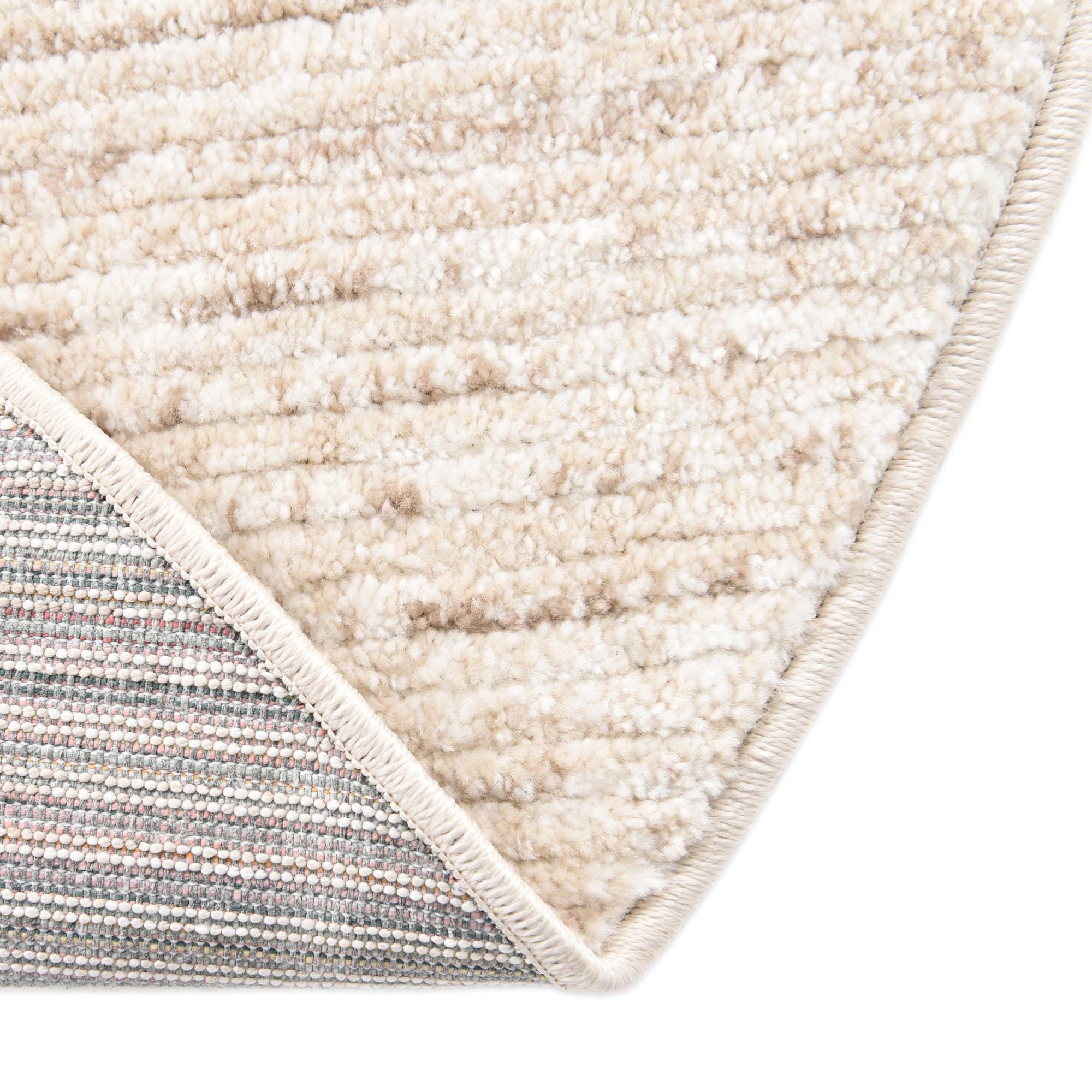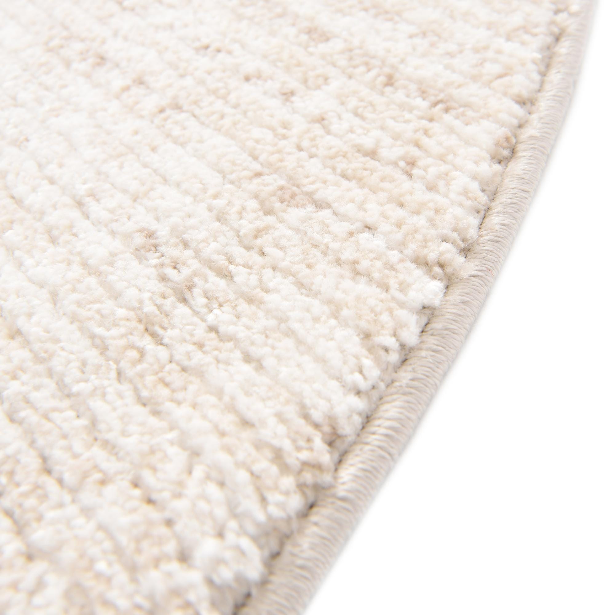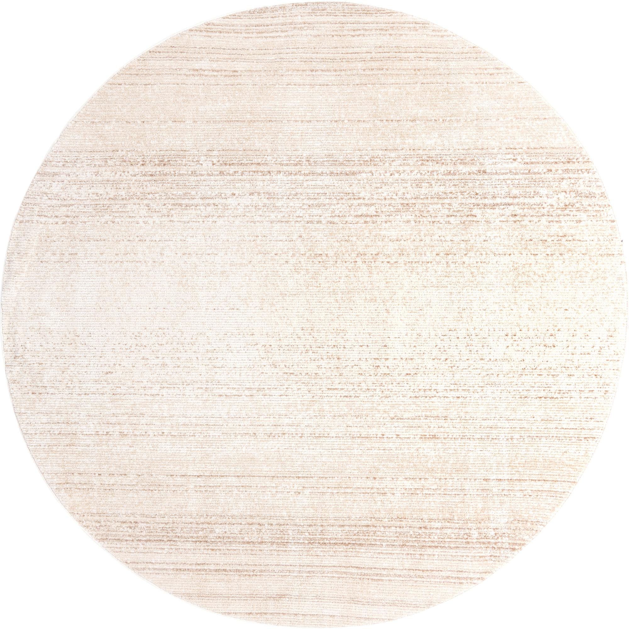 A 7' 10 round ivory and cream polypropylene rug with a subtle striped pattern on a hardwood floor in a living room.
