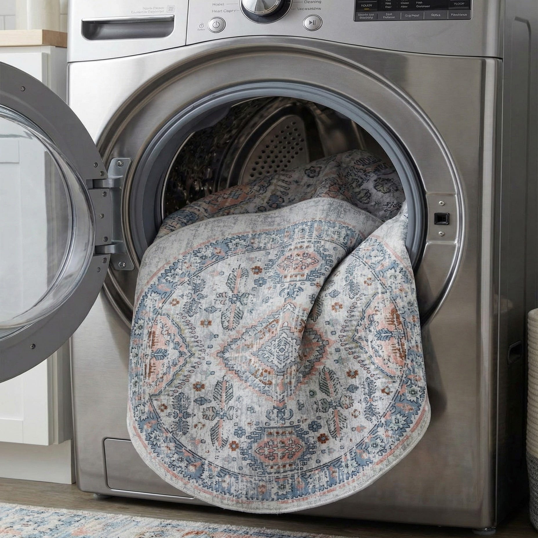 A 7' 10 round Kamala Washable rug featuring a distressed traditional medallion pattern in ivory, light blue, and blush pink.