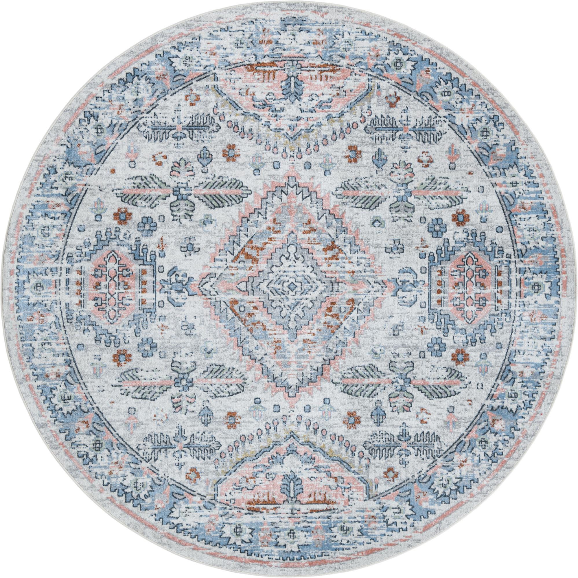 A 7' 10 round Kamala Washable rug featuring a distressed traditional medallion pattern in ivory, light blue, and blush pink.
