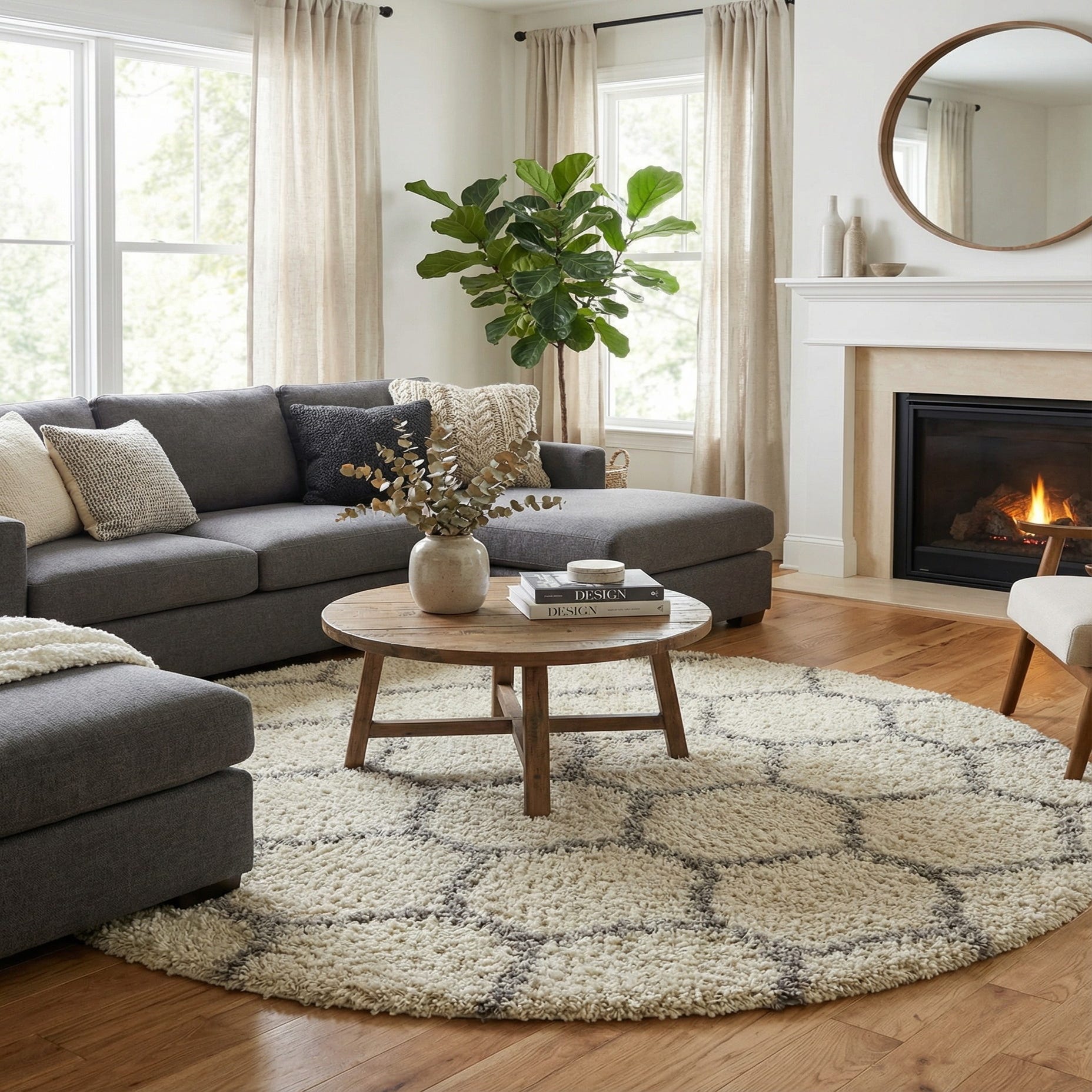 Machine-made from 100% polypropylene, the construction produces a resilient feel that holds its shape under everyday use while maintaining the plush shag appearance. The neutral ivory background with gray accents makes this round design adaptable—bringing light and pattern into a space while keeping the palette calm and composed.