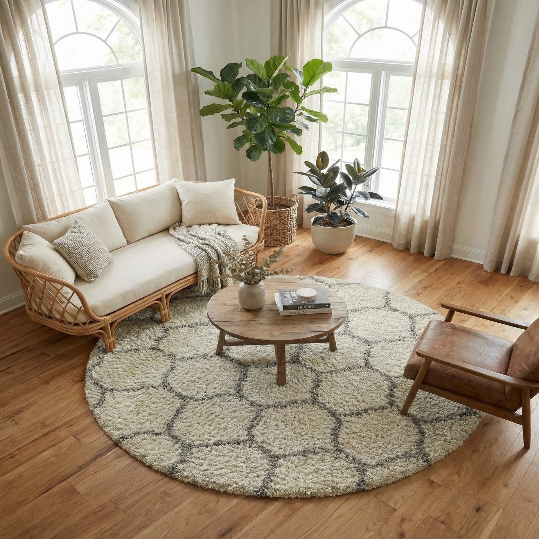 Works well beneath a round dining table or to anchor a small seating group or reading nook. Pairs naturally with light-wood furniture and soft grays for a Scandinavian or transitional look, or with navy and coastal accents for a breezy, relaxed interior. It also complements modern farmhouse and minimalist schemes where subtle pattern and tactile softness are needed.
