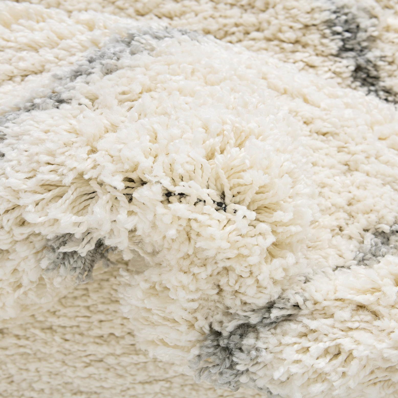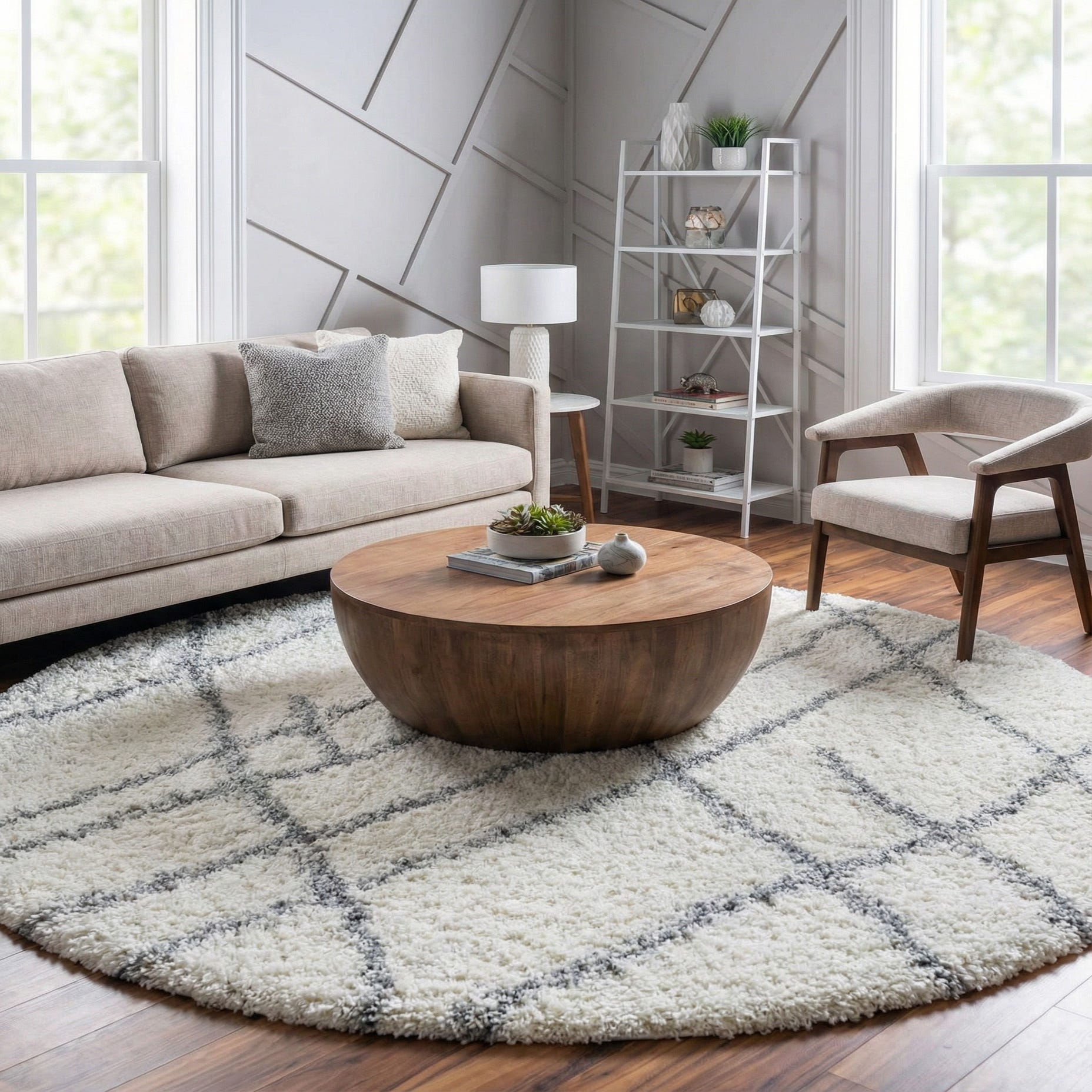 A plush, high-pile shag with a soft hand, this round area rug is machine made from 100% polypropylene. The ivory background creates a clean, airy field while a series of gray, intersecting lines form a relaxed geometric lattice of irregular diamond shapes. The dense, textured pile gives noticeable depth and a cozy feel underfoot as the gray linear pattern gently rises from the ivory surface.
